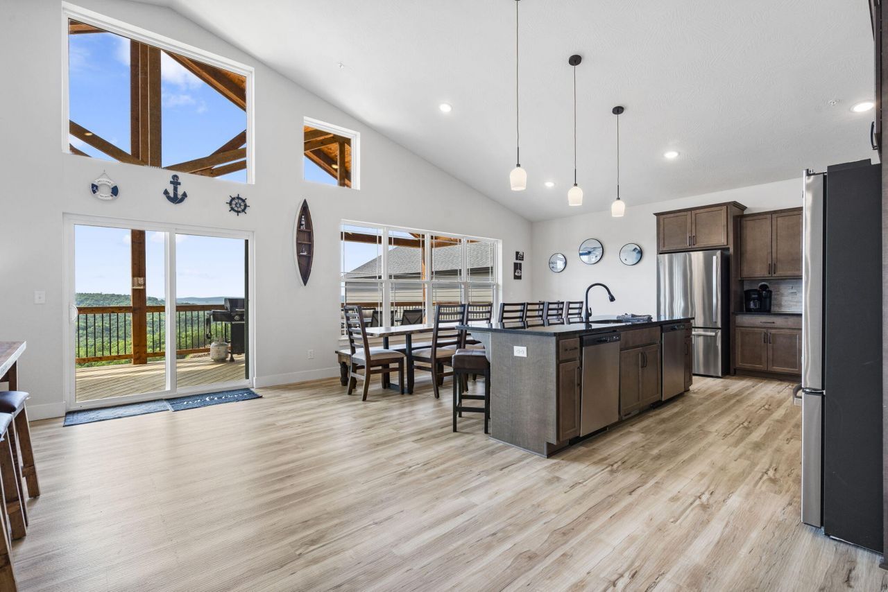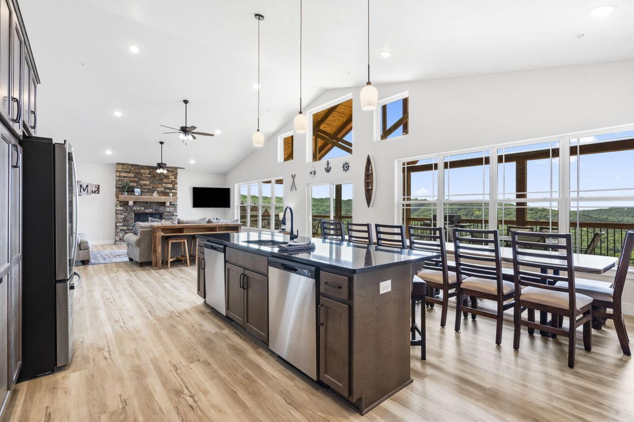 Crowne comfort! This 7-bedroom, 9-bathroom lodge comes fully furnished and turnkey ready to go. Nothing to do here but watch it happen! Features a fantastic view of Table Rock Lake, plus numerous special upgrades, including tile showers, a stone fireplace extending to the ceiling, wiring for a hot tub on a wraparound deck, and more. Conveniently located in Indian Point, Crowne View Estates sits near the popular 76 Strip, close to Indian Point Marina and the world-famous Silver Dollar City theme park. This Table Rock Lake community is a hit with visitors, thanks to its inviting indoor and outdoor swimming pools, fitness gym, playground, and proximity to the water. In addition, the homeowners' association covers all exterior maintenance, landscaping, building insurance, water, sewer, and trash service. Absolutely perfect for vacation use, nightly rental investment, or full-time living in the Ozarks.