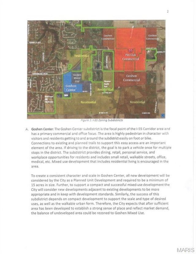 Location, Location, Location! 34+/- bordered to North by Governor's Parkway, to the West by District Drive, to South by Goshen Road & YMCA. This property is located in the I-55 Corridor District and is identified as Goshen Center; please see attachments for permitted uses as of 9/5/2025. Please verify with the City of Edwardsville if you have a specific use in mind that they will allow it. Check with city of Edwardsville on obtaining utilities. This property is 2 parcels 10-1-16-19-00-000-001.009 and parcel 10-1-16-19-00-000-001. Property, house and out buildings are included, sold as is, house and buildings have no value. Sewer is available on both sides of the property. Owners have rights to all crops in field.
