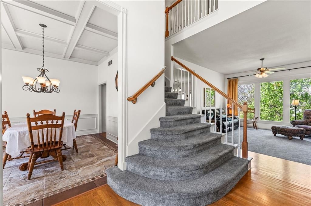 Stunning River Hills Executive Home on a Treed Corner Lot in ParkvilleWelcome to this beautifully updated home in the highly sought after River Hills subdivision, with a swimming pool and stocked pond, located within the award-winning Park Hill School District. Perfectly positioned on a private, treed corner lot, this home offers space, functionality, and timeless character throughout. Step inside to a dramatic entry and discover a versatile flex room just off the front door, ideal for a home office or sitting room. The formal dining room makes a statement with a bay window, detailed wainscoting, and a distinctive beam ceiling with tile inlay and wood surround. The heart of the home is the expansive great room, featuring soaring ceilings, walls of windows that flood the space with natural light, and a cozy fireplace. The adjoining kitchen and hearth room create the perfect gathering space, offering abundant cabinetry, generous workspace, and seamless flow for everyday living and entertaining. Just off the garage entry, youll find a convenient main-level laundry room. The oversized 3-car garage provides exceptional storage potential.One of the standout features is the 20x12 covered, screened-in deck complete with lighting, TV setup, and stairs to the backyard?truly functioning as an additional living space to enjoy year-round. Upstairs you will find 4 spacious bedrooms with the primary featuring a sitting area. The finished walkout lower level offers incredible flexibility with a huge open recreation area, full bath, abundant storage, and a non-conforming 5th bedroom perfect for guests, hobbies, or multi-generational living. Recent updates include new interior paint, new roof, and new garage doors, along with a Rain Bird sprinkler system for easy lawn maintenance. This is a rare opportunity to own a spacious, move-in ready home in one of Parkvilles most desirable neighborhoods offering comfort, style, and room to grow.