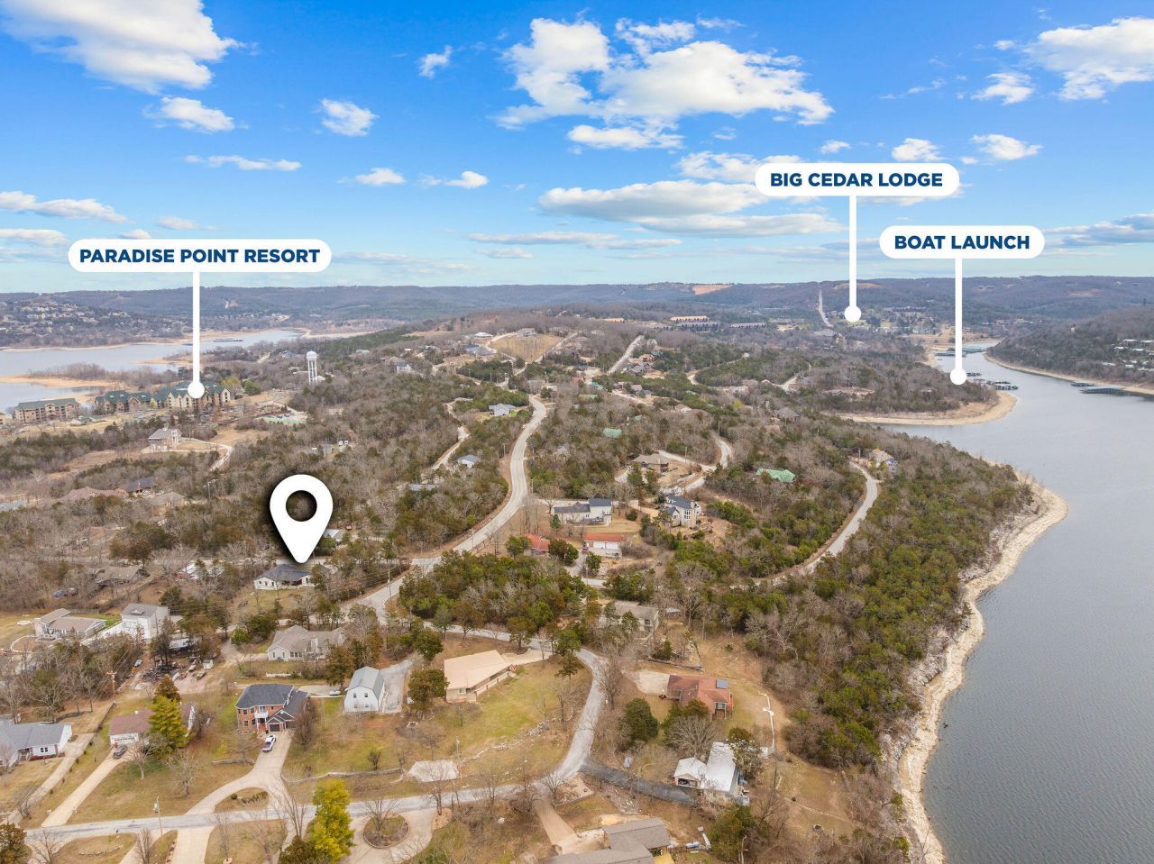 Stunning down-to-the-studs remodel in one of the area's most desirable lake locations near Big Cedar Lodge! This 3 bed, 2 bath home offers an open-concept living area filled with natural light & modern finishes throughout including inviting covered front porch, kitchen with gorgeous guartz countertops, solid wood soft close cabinets, large island & pantry, spacious master suite with patio access, bath with soaking tub, walk in shower & closet, laundry room with sink, water filtration system & so much more! Situated on a large double lot, the property features a huge patio perfect for entertaining and a rare drive-thru garage adds exceptional functionality for boats, lake toys, or golf carts. Prime location with unbeatable access to dining, recreation, and lake living. Ideal as a full-time residence or vacation getaway. Big Cedar Boat Ramp conveniently located 2 minutes away! This is a rare find in a popular location!