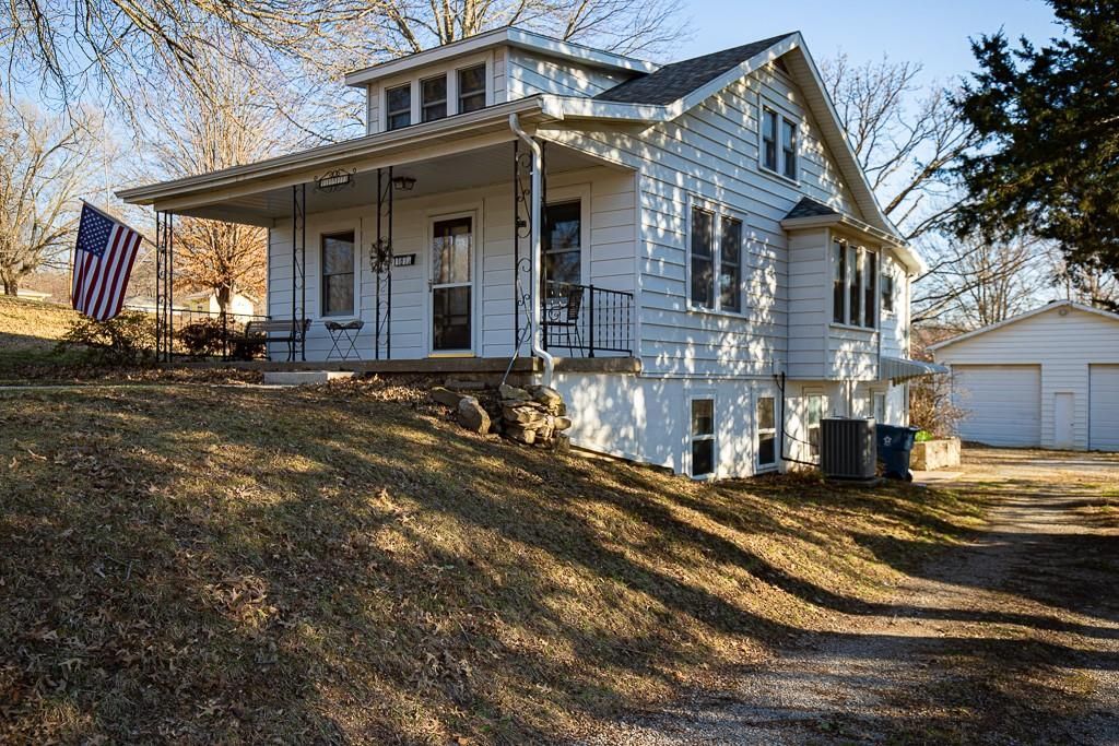 Mechanics Dream Garage with 10 foot garage doors Same owner for almost 60 years! Lovingly maintained Farmhouse style Bungalow is bright and cheerful with loads of natural light throughout! Main floor primary bedroom with en suite bathroom. Cozy living room and dining areas lead to the galley style kitchen overlooking your beautiful back yard consisting of a total of 5 combined lots with beautiful plants and trees! You will love the covered front porch overlooking the front yard. There is a wrap around deck on the back and side of the home connecting to the beautiful Sun Room. Need a third bedroom? Per the owner, the sun-room is capable of connecting to the furnace and AC for heating and cooling and could be a third bedroom if you add a closet. The second bathroom is between the dining room and sun-room and has a shower. The second floor boasts a large bedroom with an abundance of built in drawers and closets and could easily accommodate 2 beds. The basement isunfinished but is a walk out and has plenty of windows on the west side. It could easily be finished as a family room oradditional bedroom space. There is another set of washer and dryer hook ups in the basement if you prefer. The HVACwas installed in 2016 and the roof appx 10 years ago. For those you dream of additional green space, you will love thelarge lot between you and the east neighbor! Many of the items from the previous inspection report have been repaired now termite treatment of both home and garage ARE COMPLETE WITH ONE YEAR WARRANTY extendable for $95 per year, radon remediation scheduled for 4/20/26, sewer line clearing of tree roots completed on 4/13/26 with new camera scope that will be added. Other than items completed or currently scheduled, the home is selling AS IS