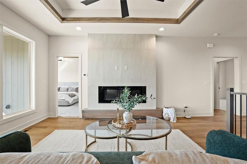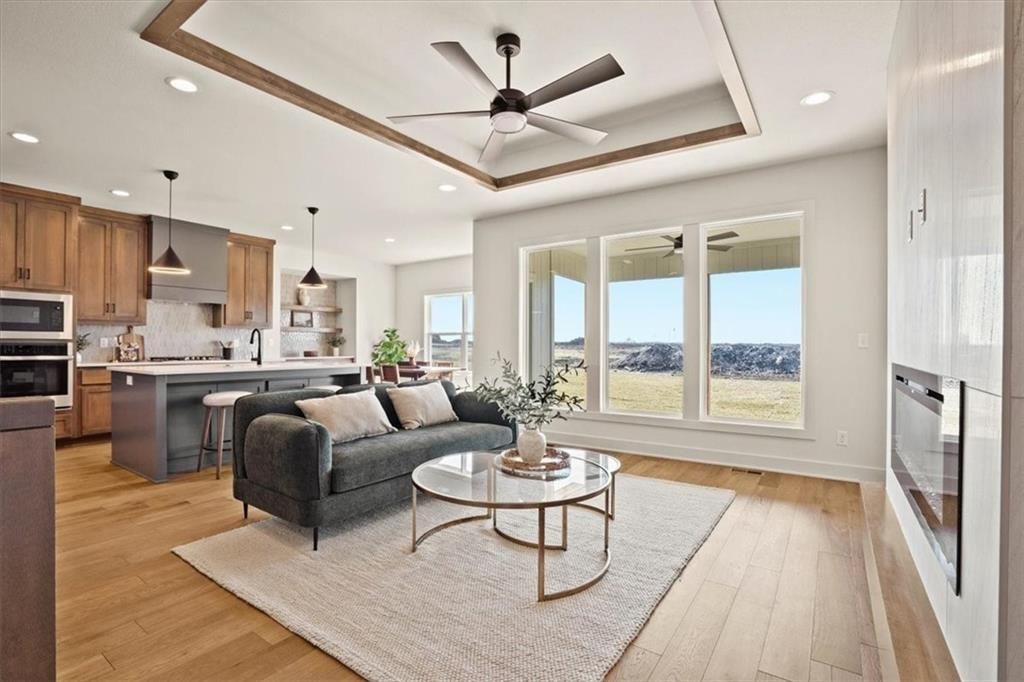 Experience the perfect blend of modern sophistication and functional design with the Greystone model by Elevate Design + Build, nestled in the exclusive Prairie View of the Good Ranch. This stunning 4-bedroom, 3-bathroom reverse 1.5-story home is situated on a corner lot, offering the rare combination of a quaint, tranquil atmosphere and close proximity to Raymores premium shopping, dining, and highway access. The heart of the home features a sun-drenched, open-concept living area anchored by a striking floor-to-ceiling fireplace and a gourmet-inspired kitchen. Culinary enthusiasts will love the sleek finishes, expansive walk-in pantry, and seamless flow to the covered rear deck?perfect for sunset views over the rolling meadows. The main level thoughtfully hosts both the luxurious primary suite and a secondary bedroom, while the finished lower level provides a generous recreation room, two additional bedrooms, and ample storage. Residents of Prairie View enjoy the rich heritage of the Good Ranch, complete with scenic woodlands, and the peace of mind that comes with living in the highly-rated Raymore-Peculiar School District.