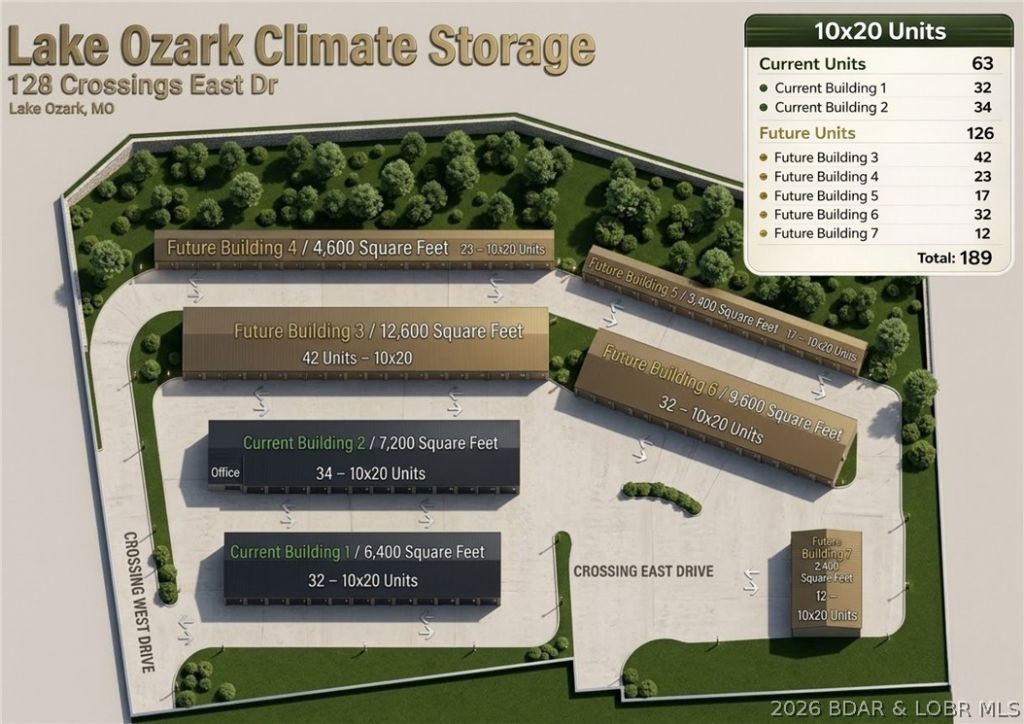 Prime investment opportunity with an established storage business in one of the most sought-after locations at the Lake. Ideally situated just off Business 54 and adjacent to Hwy 242. You won't find storage units for sale with the location, income, and room to grow like this. Designed with tenant convenience in mind, the facility features dual drive-through entrances-perfect for trucks and trailers with no need to turn around. The site sits on over 3 acres and is thoughtfully designed to complement surrounding professional buildings, enhancing its curb appeal and visibility. Currently offering 13,600 square feet of storage, the property includes engineered plans for significant expansion up to 46,200 square feet-creating incredible potential for increased revenue and long-term growth. 66 storage units that are 10x20 in size with 34 of those climate controlled options. Additional features include a spacious office with a large restroom, excellent signage visibility from busy Lake Ozark intersection with strong traffic exposure. Located just 1.6 miles from the proposed casino development, this property is positioned to benefit from future area growth. Call about this rare opportunity