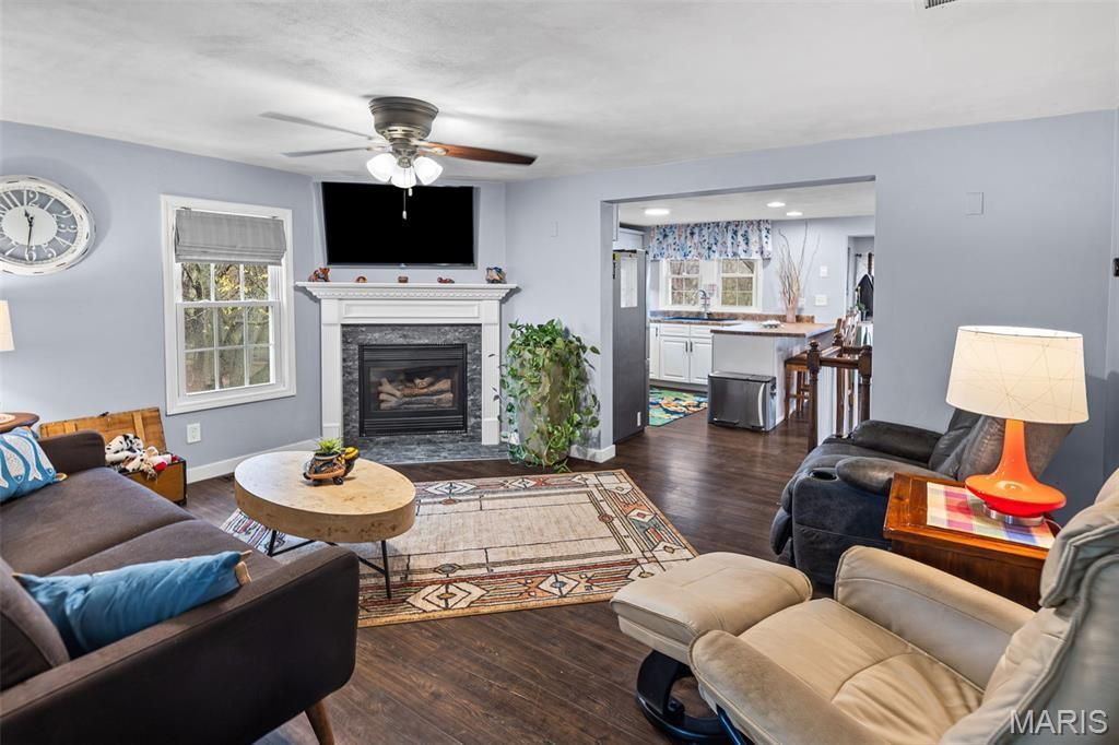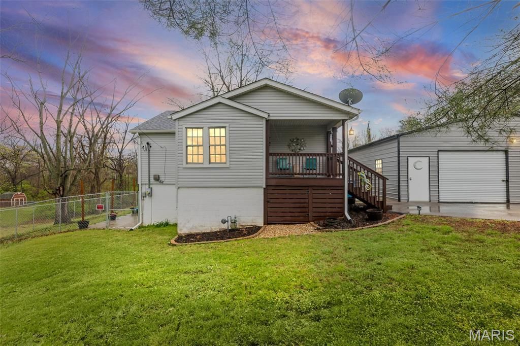 SHOWINGS BEGIN ON SATURDAY 4/4. Welcome home to this beautifully updated ranch, perfectly positioned on an endless private lot and designed for those who value outdoor living, space, and versatility. From the moment you arrive, you'll notice the rare combination of modern updates and a property that truly lets you spread out and enjoy it. The outdoor setting is where this home truly shines. Sitting on nearly 3 acres of gently sloping, partially fenced grounds with woods and a creek, this property offers endless possibilities-gardening, entertaining, recreation, or simply enjoying the peace and privacy of your own space. Whether it's morning coffee under the trees, weekend barbecues, or quiet evenings under the stars, this property delivers the kind of outdoor lifestyle that's hard to find. A standout feature is the exceptionally large detached garage/workshop-perfect for hobbyists, car enthusiasts, or anyone needing serious workspace and storage. With room for multiple vehicles, tools, and projects, it's a rare and valuable addition that sets this property apart. Inside, the main living area is bright and welcoming with updated flooring and warm hues that enhance the space. Throughout the home, you'll find it has been tastefully refreshed with today's design touches, giving it a clean, comfortable feel. The fully remodeled kitchen features stylish cabinetry, quality countertops, and stainless steel appliances-functional and attractive for daily meals or entertaining. Convenience continues with main-floor laundry and a spacious, comfortable bedroom and bathroom with garden tub. The mostly finished walkout basement is bright and cheery, offering a second bath and bedroom with huge walk in closet. Updated bathrooms on both floors showcase contemporary fixtures and finishes, adding to the home's move-in-ready appeal. Recent improvements include kitchen appliances, AC condenser and evaporator, and the detached garage-all new in 2023. The furnace and roof are newer as well, offering added peace of mind. If you've been searching for a home that combines thoughtful updates with outdoor space and a true workshop setup, this one delivers. Enjoy the the privacy of a large lot at the edge of town, and the flexibility to live, work, and relax the way you want. Quiet location with close by access to I64, I55 and I270 for commuting to the St Louis area or to Scott AFB.________________________________________