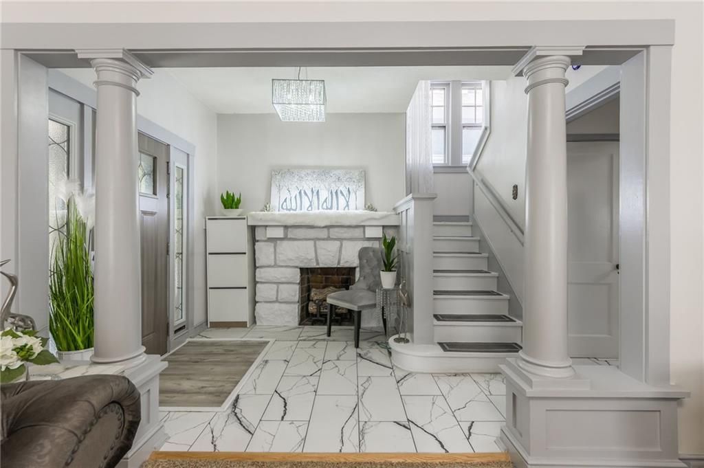 Prepared to be in aww as you walk through the front door of this beautifully remodeled Shirtwaist home located in Kansas Citys Historic Northeast. This classic turn-of-the-century style retains its original character including the signature stone foundation, front gable, and covered front porch while offering extensive modern updates to the main level.Interior features include a bright entry foyer with white masonry fireplace, marble-patterned tile flooring (original hardwoods underneath), and fresh paint throughout. The main level offers formal living and dining rooms with updated lighting, bay window, and new blinds, along with a family room and a remodeled ¾ bath (2024).The updated kitchen (2024) includes new cabinetry, countertops, sink, faucet, and appliances. Gas line is available behind the current electric range.The second floor features three bedrooms, including a spacious primary bedroom with access to a sunroom room that also serves as a laundry area with washer & dryer hookups. The full bath has been updated, and the attic provides ample storage or potential additional living space. Zoned HVAC services the second floor and attic.The lower level includes a finished office area, utility space, and additional shower & toilet. Exterior improvements include widened driveway, updated concrete, new landscaping, patio, three-sided privacy fence, detached garage, and lean-to.Numerous updates completed in 2024, including fresh interior paint, remodeled bathrooms, kitchen updates, and exterior improvements. This property offers a rare combination of historic charm and modern functionality.