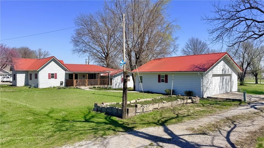 Super-efficient, very well-maintained home that offers comfort, functionality, and peace of mind all on one level. This 2-bedroom, 2 full bathroom home has been thoughtfully updated, with a remodel completed approximately 20 years ago when the home was extensively renovated and major components were updated throughout. Exterior features include durable metal roofing and low-maintenance vinyl siding. Enjoy low utility bills with Evergy for electric, high-efficiency furnace, central air, and energy-efficient double pane windows. Inside, youll find a spacious layout with central heat and air, an inviting kitchen with beautiful oak cabinets, convenient slide-outs, abundant storage, included appliances, and a laundry area just off the kitchen for added ease. Step outside to enjoy a stamped concrete front porch, a covered back deck perfect for relaxing or entertaining, and a nice yard with space for a garden ? plus a raised bed already producing strawberries. The property also features a concrete driveway, a 1-car attached garage, and an oversized 2-car detached garage, offering plenty of room for vehicles, storage, or a workshop. Enjoy a prime location within walking distance to the high school, middle school, walking trail, soccer field, and park. This is a solid, move-in ready home that has been exceptionally cared for and is ready for its next owner.