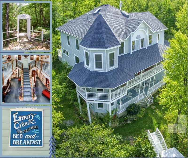 Situated on just under 7 wooded acres m/l with walking trails throughout, this property is furnished with timeless Victorian decor. It features 8 beautifully appointed en-suite suites with jetted tubs, over 7,400 sq ft of living space across three stories, central vacuum system, and much more.Emory Creek Bed & Breakfast operated as a 5-star upscale inn for 22 years, hosting weddings, private getaways, and dinner theater entertainment. The property is partially zoned NR 3 in Taney County and includes a billboard with Hwy 65 frontage. It's conveniently located just minutes from Hwy 65, providing quick access to Silver Dollar City, Branson Landing, shopping, and all that Branson has to offer.This turnkey investment opportunity is ready for a new owner to continue its legacy or explore new ventures such as a primary residence, vacation rental, spa and wellness center, retreat with cabins, boutique motel, and more.