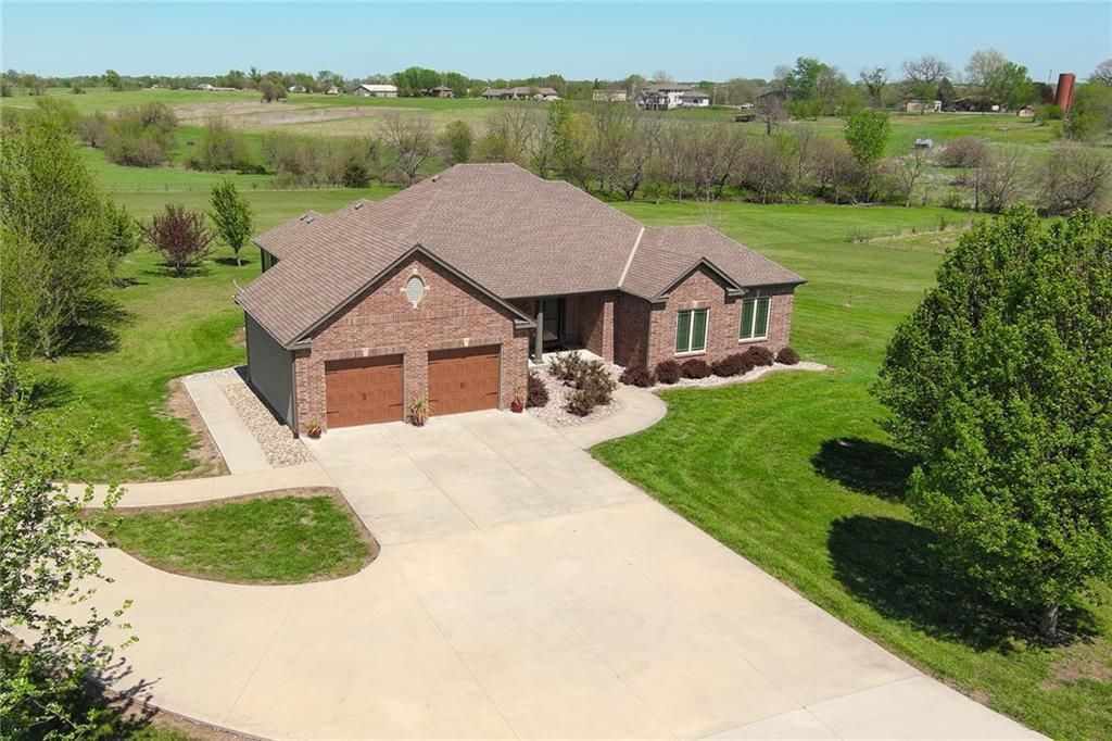 This stunning custom-built all-brick ranch sits majestically atop a hill, offering breathtaking views and the perfect blend of luxury and functionality. Designed for true main-level living, the home features three spacious bedrooms on the main floor. Two secondary bedrooms provide excellent flexibility for guests, family, or a home office?complete with abundant natural light and beautiful wood flooring.The expansive primary suite is a true retreat, easily accommodating large furniture and complemented by a spa-like ensuite featuring a walk-in shower, jetted soaking tub, double vanities, and an impressive walk-in closet.Enjoy both formal and casual living with a dedicated dining room and an open-concept kitchen equipped with a cooktop, granite countertops, stained wood cabinetry, and a large pantry. The kitchen flows seamlessly into the great room, where a striking stone fireplace and walls of windows showcase the propertys scenic surroundings.An enclosed four-season sunroom extends the living space, perfect for relaxing or entertaining year-round. Additional main-level conveniences include a drop zone off the garage, and a second laundry option in the pantry.The partially finished walk-out basement adds even more versatility with a fourth bedroom, full bathroom, family room, and a second laundry area. There is ample opportunity to expand, with space for two additional bedrooms and a fourth bathroom?featuring daylight windows for added comfort and value.Outside, the property truly shines with approximately 12 acres of agricultural land, plus an additional 2 acres surrounding the home. A massive 2,900 sq ft utility building includes solar power that saves tons on utility bills, ideal for a variety of uses. The property is fully fenced and secured with a grand electric entry gate.Enjoy the best of both worlds?peaceful country living with a prime location offering convenient access to everything the Kansas City area has to offer.