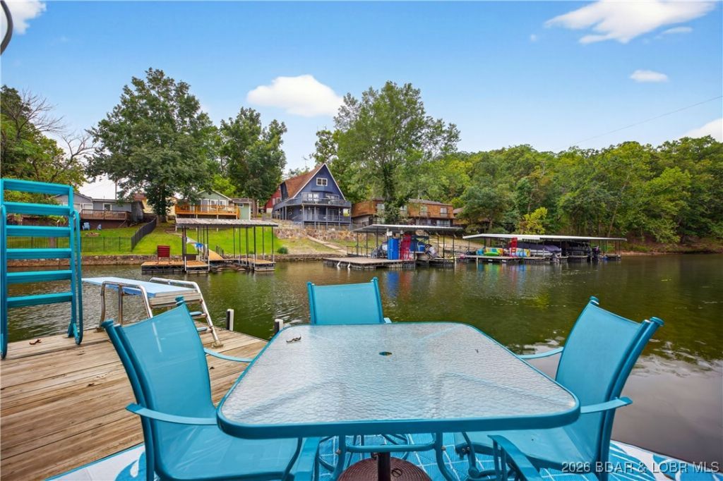 In the calmer waters of the Gravois Arm at Lake of the Ozarks (8MM), 15231 Martingale Road is built for easy lake living AND smart investing. The walk-in main level features two master suites plus two additional bedrooms, while the lower level offers the kitchen, dining, living room, and a convenient half bath. Step onto the covered deck or down to the martini deck for long, laid back evenings and effortless entertaining. Down at the water, with over 160 feet of shoreline, enjoy a dock with two boat slips w/hoists, a PWC slip w/hoist, swim platform, and covered seating. Bonus!! This package includes an adjoining lakefront lot, ideal for extra parking, gatherings, or future plans; AND, rentals are allowed for the investment savvy!