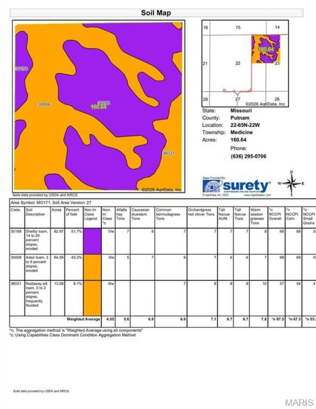 161.1 Surveyed acres Putnam County 133 ac tillable. Current farm lease runs until the end of 2027 paying $175 per tillable acre. Additionally, the farm has a hunting lease paying $20 per acre. Priced at $6,000 per acre.