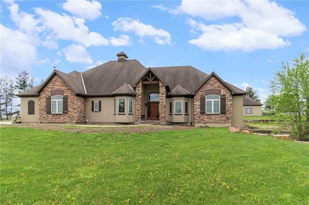 Set on nearly five acres just outside of town, this Kearney estate checks every box and then adds a few you didnt know you needed. Inside, the main living space opens into a layout that feels open and intentional. The living room, dining area, and kitchen flow together seamlessly, anchored by hardwood floors and natural light. A fireplace with custom built-ins adds a focal point.The kitchen is built for real life and gatherings. Granite countertops, custom cabinetry, double wall ovens, and an oversized island make prep and hosting easy. A walk-in pantry keeps everything tucked away. The main level offers flexibility with a front room that can serve as a bedroom, formal dining space, or office. Two additional bedrooms share a well-designed bath with separate vanity areas. The primary suite is set apart, featuring a large walk-in closet and spa-like bath with soaking tub, tiled shower with dual heads, and double vanity. Laundry and a half bath complete the level. Downstairs, the finished lower level is built for hosting. A full wet bar with a large island opens into a second living area with its own fireplace. A private bedroom and bath make it ideal for guests or multi-generational living, along with a half bath and flexible space for a gym, office, or sixth non-conforming bedroom. Storage is extensive, with a suspended slab design offering approximately 55x31 of storage space, plus an additional 21x11 area that also functions as a secure storm shelter. The six-car attached garage provides plenty of space, and the detached 50x60 shop adds even more with its own office, bathroom, car wash, and paint bay, plus an unfinished upper level. Built with intention, the home features structural beams for wide open spaces, twelve-foot ceilings on both levels, geothermal heating, and energy-efficient windows. Mineral rights convey with the property, including oil and water discovered during the geothermal process and registered with the Missouri Department of Natural Resources.