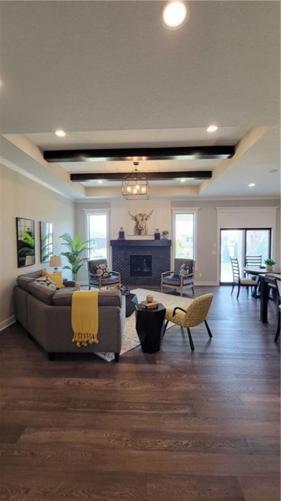 The Richmond plan by Gabriel Homes in Stonebridge Villas offers a reverse 1.5-story layout with 4 bedrooms, 3 baths, and 3-CAR GARAGE. Home is under construction. Open-concept main level features an expansive great room with fireplace, 10-ft ceilings, and large windows overlooking the greenspace. Kitchen includes center island, quartz surfaces, stainless appliances, soft-close cabinetry, and walk-in pantry. Primary suite on main level with dual vanities and large tiled shower. Daylight lower level includes rec room and two bedrooms with full bath. Outdoor living features a covered deck for sunset views. Maintenance-provided community with pool, clubhouse, pickleball courts, and trails. 0.7 mi to Heritage Park. Approx. 1.3 mi to Price Chopper and minutes to I-35. Contact listing agent for construction details.