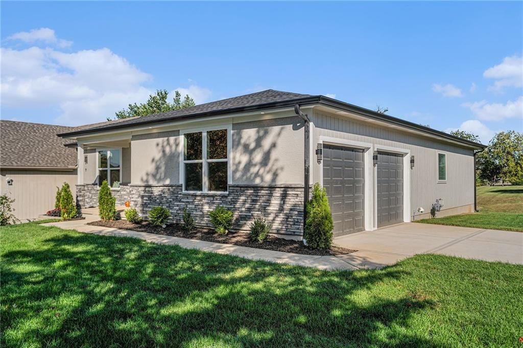 PRICE IMPROVEMENT! BUILDER SALE $38,000 OFF original list price. Gorgeous reverse 1.5-story home by two trusted Kansas City builders with 50+ years of combined experience. QUALITY CRAFTSMANSHIP and luxury finishes shine throughout. BUILDER ONE YEAR WARRANTY INCLUDED.Step through into a soaring great room with floor-to-ceiling windows, DRAMATIC 8 FOOT DOORWAYS on the main level, a modern electric fireplace, and open flow to a CHEFS KITCHEN featuring custom wood cabinetry, quartz countertops, tile backsplash, and premium KitchenAid + Frigidaire appliances. Be sure to look inside the cabinets and drawers for extra storage drawers and thoughtful hidden details..The main level is built for everyday living, offering a MAIN LEVEL PRIMARY with LUXURY SPA ENSUITE, double vanity, SOAKING TUB, and DUAL WALK IN CLOSETS, plus a second bedroom with its own full bath?ideal for a home office, a separate half bath for guests and a MAIN LEVEL LAUNDRY ROOM.The FINISHED WALK OUT BASEMENT expands your space with two additional bedrooms connected by a Jack-and-Jill bath, a large living room, and a convenient half bath for guests?perfect for entertaining. The basement also features a hidden storm shelter, and an expansive utility room (it is plumbed and has its own electrical panel if future expansion is ever wanted)Enjoy a PARK LIKE SETTING, best viewed from the elevated deck, in a quiet & friendly neighborhood.ENERGY EFFICIENT features include a high-efficiency furnace, tankless water heater, and energy-smart high end PELLA WINDOWS. Prime location near I-435, The Legends, parks, and schools?quiet setting with easy access to everything.