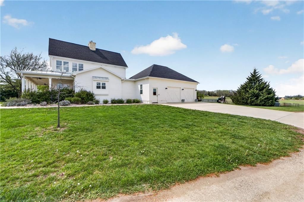 10 acres on blacktop ? a rare blend of modern comfort and full-function hobby farm living. Built in 2020 as the sought-after builders personal residence, this open-concept home offers 6 bedrooms, 3.5 baths and 4,032 total sqft with thoughtful finishes throughout.Main living features include a dramatic two-story great room with abundant windows, wide-plank white oak engineered floors, a see-through fireplace between the dining room and living room, and a chef-ready kitchen flowing to living and entertaining spaces. The primary suite is conveniently located on the main level and opens to a large screened porch that, together with the dining room, leads out to an expansive concrete patio ? ideal for indoor-outdoor living. Two oversized bedrooms upstairs include vanities/sinks plus a full upstairs bath; three additional bedrooms are located below grade. Practical comforts: main-level and basement laundry, an oversized two-car garage, and a large finished six-sided concrete storm shelter.Outdoor and outbuilding amenities are built for hobby farmers, equestrians, and weekend hosts. Approximately 2.5 acres are fenced and improved with a horse barn that has power and water. The back 5 acres serve as productive hay pasture. The 2,400 sqft barn/shop includes a 1,600 sqft insulated, heated & cooled shop space with two overhead doors and a full bath, plus an 800 sqft one-bedroom apartment with kitchen/living area, full bath, W/D hookups and a wraparound covered porch ? perfect for rental income, guest quarters, or on-site help.Additional property highlights: chicken coop with power, water and indoor/outdoor access; raised-bed garden area with water run; a 33-ft above-ground pool with deck and awning for summer entertaining; and abundant acreage for riding, gardening, or expansion.Location is exceptional ? just one mile from the new elementary school in the award-winning Basehor-Linwood School District.