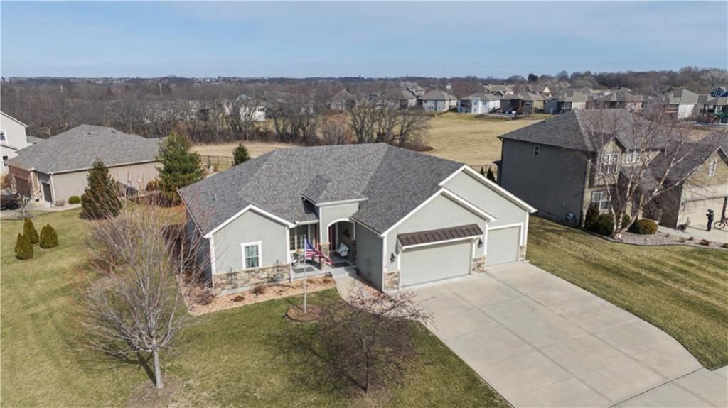Former model home in highly desirable Greyhawke at the Lake! This spacious 4-bedroom, 3-bath residence offers an open and airy floor plan with tall 6-panel doors, large closets, and quality finishes throughout. The main level features three bedrooms, including a private primary suite with dual vanities, a jetted tub, a tiled glass walk-in shower, and a private water closet. Hardwood floors flow through the great room, dining area, and kitchen, and a gas fireplace anchors the living space perfect for both everyday living and entertaining. The finished daylight basement provides flexible space for recreation, guests, or hobbies. Step outside to enjoy the covered patio overlooking a beautifully landscaped corner lot that adjoins green space and includes an in ground sprinkler system. A security system and internal antenna streaming system are added bonuses. The three car attached garage offers plenty of room for vehicles, storage, or lake gear. Recent updates include a new roof and gutters for added peace of mind. Located just minutes from Smithville Lake and Paradise Pointe Golf Complex, with easy access to top-rated Smithville schools and Northland amenities, this home delivers space, comfort, and an unbeatable location.