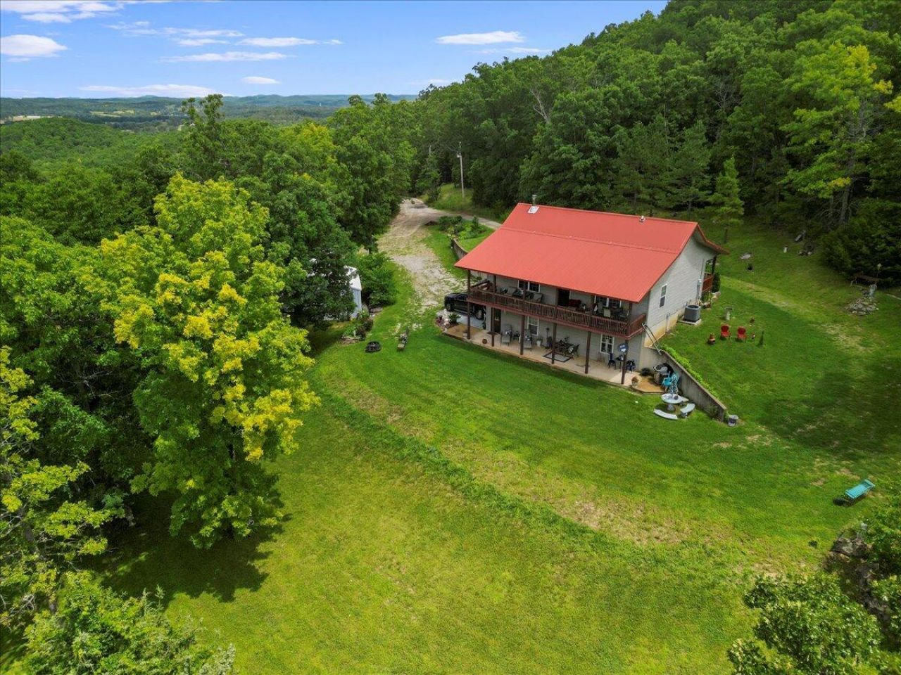 Welcome to your private Ozarks retreat! Nestled on 42 wooded acres in the rolling hills of the Missouri Ozarks and bordering 40 acres of pristine Missouri conservation land, this 2-bedroom, 3-bath home offers serenity, space, and scenic beauty. Whether you're seeking a full-time residence, hunting haven, or nature lover's escape, this property delivers unmatched privacy and natural charm.Step inside to discover an open-concept living and kitchen area with vaulted ceilings that invite in warm, natural light. The cozy pellet stove adds rustic charm and efficient warmth to the main living space. Brand new luxury vinyl plank flooring in the living room and primary bedroom adds style and durability. The vaulted primary suite is a true retreat, while the spacious walkout basement provides additional living or recreational space and leads to a patio?perfect for entertaining or soaking in the peaceful surroundings.Enjoy stunning panoramic views of the Ozark hills from your covered back deck, where deer, turkey, and other wildlife frequently visit the backyard, creating an ever-changing natural backdrop. A covered front porch adds even more outdoor living space to enjoy your surroundings.The attached, heated and cooled 2-car garage is currently used as additional living space, and the 24' x 24' metal shop with concrete floor is ideal for hobbies, storage, or equipment. Whether you're a hunter, hobbyist, or homesteader, the possibilities here are endless.This is more than a home?it's a lifestyle of peaceful seclusion, outdoor adventure, and rustic comfort. Schedule your private showing today and experience the magic of the Missouri Ozarks.