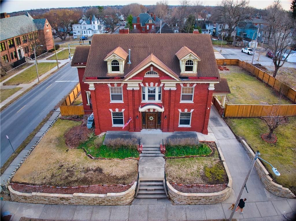 Timeless architecture, extraordinary craftsmanship, and over 5,100 square feet of beautifully preserved history - this stately all-brick residence is truly one of a kind. From the moment you enter through the original leaded glass doors, the grand foyer sets the tone with soaring ceilings, rich hardwood floors, and remarkable millwork that simply cannot be replicated today.The main level showcases stunning walnut-paneled formal dining, box-beamed ceilings, built-ins, multiple fireplaces, and a gracious great room designed for gathering. The updated kitchen blends historic character with modern function, featuring custom cabinetry, granite countertops, a gas cooktop, double ovens, a pantry, and seamless access to the butlers pantry and formal dining room. A dream office with a wet bar offers flexibility for work or entertaining.Upstairs, the second level offers a luxurious primary suite with a newly remodeled master bath, along with additional spacious bedrooms - including private bath access and a charming sunroom retreat. The third level continues the story with two large bedrooms, a full bath, bonus living space, and endless possibilities for guests, hobbies, or play.Recent improvements provide peace of mind and efficiency, including a new furnace, an added security system, a pellet stove, zoned HVAC, and solar panels. A half bath has been added in the basement for convenience. Outside, enjoy the expansive deck and covered porch overlooking the property, plus a 3+ car carriage-style garage with potential for studio, workshop, or guest quarters.Historic elegance. Modern updates. Grand scale. This is more than a home - its a legacy property.