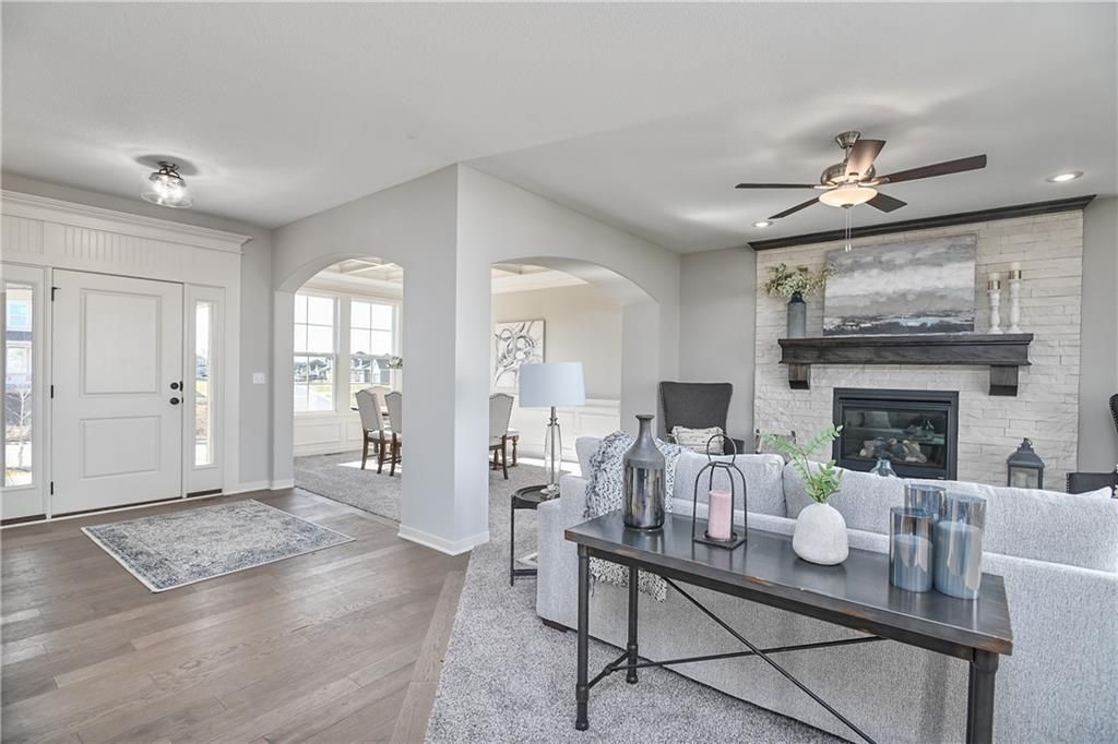 The Levi II offers an exceptional blend of space, style, and functionality with expanded square footage and upgraded finishes throughout. The enlarged kitchen and breakfast area feature custom cabinetry, granite countertops, a large center island with seating, tile backsplash, upgraded faucet, walk-in pantry, and stainless steel appliances?perfect for everyday living and entertaining. Hardwood floors extend through the entry, kitchen, breakfast area, and mud room. A versatile main-level flex room with closet and wood-paneled ceiling provides ideal space for a home office or fifth bedroom. The mud room includes a boot bench and entry closet, while the great room is anchored by a stone direct-vent fireplace with wood mantle. The primary suite is a true retreat, offering a separate sitting area, vaulted ceiling, expanded walk-in closet, and spa-like bath with granite countertops, soaking tub, and walk-in tile shower. All bedrooms feature vaulted ceilings. Upstairs highlights include a loft area with built-in bookshelves, a hallway window for added natural light, and a spacious laundry room with custom cabinetry and granite countertop. Tile flooring is featured in all bathrooms and the laundry room, with Berber carpet on the stairs. Enjoy outdoor living on the covered patio with a full sprinkler system. Located in Prairie Farms, residents enjoy neighborhood amenities including walking trails, pool, playground, and convenient walking distance to Lake Olathe.