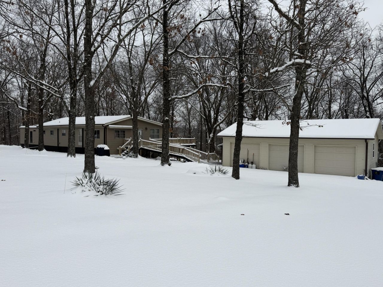 This manufactured home on a permanent foundation is tucked away from the road in a beautiful park-like setting on 6.01 acres! With the addition, it offers over 1,600 sq ft of living space, featuring 3 bedrooms, 2 baths, a spacious living room, and an updated kitchen with stainless steel appliances, ample cabinetry, and a dining area. Enjoy the 4-season sunroom with built-in bench, a detached 3-car garage, an office/cabin for guests, and a man cave/she-shed with propane heat, water, and electric. Upgrades include a newer roof with transferable warranty, wrap-around deck with ramp, updated LED lighting, sinks, faucets, countertops, newer LVP flooring, front siding, dusk-to-dawn security lights, vinyl wallpaper, multiple hydrants, and two additional laundry hookups (currently in the third bedroom). Located approximately 600 ft from Bennett Spring Conservation Area, with hiking, hunting, camping, and trout fishing nearby at Bennett Spring Park. Enjoy peaceful country living with abundant wildlife!