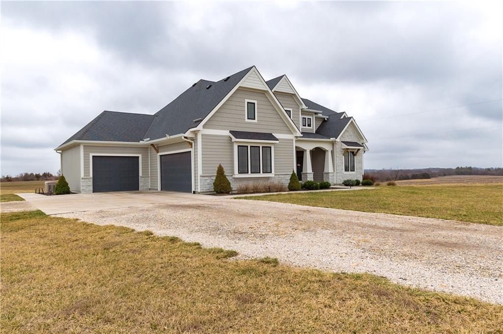 Experience unrivaled craftsmanship in this custom-built masterpiece, where high-end estate elegance meets serene rural living. Sprawling over 4,500 sq. ft. with 5 bedrooms and 3.5 bathrooms on nearly seven private acres, this sanctuary offers breathtaking sunrises and total privacy.The open-concept main floor features a great room with soaring windows and a stunning custom fireplace accent wall. The chefs kitchen boasts massive counter space, high-end appliances, and a walk-in pantry, situated near a quiet in-home office with rolling acreage views. The primary suite is a spa-inspired retreat with a custom walk-in shower and a large closet connected directly to the laundry room. Upstairs, find three generous bedrooms and a cozy reading nook with elevated views of the countryside. The walk-out lower level is built for entertaining, featuring a custom wet bar, a large multi-purpose lounge, and flexible bedroom spaces leading to a sprawling backyard patio.Luxury meets utility with an attached 3-car garage designed to house full-size trucks and SUVs that walks into a custom designed mudroom. This property also brags a massive 40x60 stand-alone workshop equipped with its own electrical panel?perfect for hobbies or a home business. Enjoy the peace of nature from the covered patio while remaining close to modern conveniences. This Lansing School District estate offers easy access to highways, Fort Leavenworth, and the Legends, with Kenneth Benard Park within walking distance. So many custom and well thought out finishing touches with this home truly make it unique and special! Dont miss this rare opportunity for elegant rural living on private acreage!