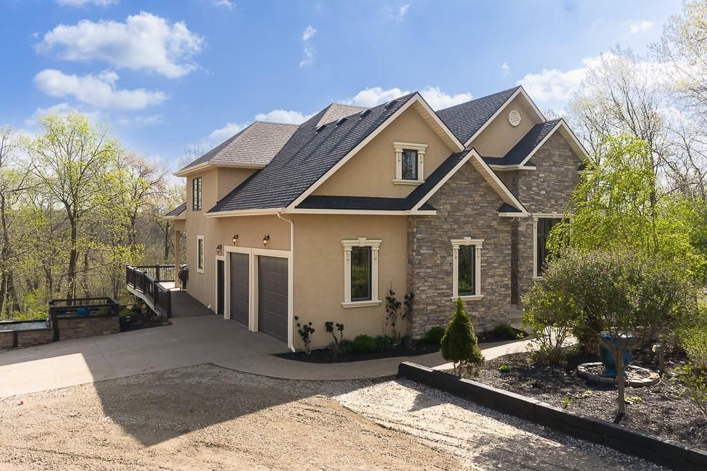 SECLUDED WOODED RETREAT WITH LUXURY FINISHES, MULTIPLE GARAGES, AND BEAUTIFUL HIDDEN COUNTRY VIEWS! This 5 bedroom, 1.5 story home sits on 5.23 private acres and offers a chefs kitchen with gas range, pot filler, built-in oven, warming drawer, pantry, and travertine floors. The marble entry opens to a great room with soaring ceilings and a wood-burning fireplace, while the dining room and great room feature hardwood floors for a warm, upscale feel. The main-floor master suite includes a walk-in closet and a luxury bath with jetted tub, custom shower with 3 spray heads, heated floor, and heated towel rack, plus there is also a main-floor office. Upstairs youll find 3 bedrooms, a den, full bath, booster fans for heating and AC, and a laundry chute to the main-floor laundry. The walkout basement adds a 5th bedroom, large family room with pellet stove, full bath, and 2 more garages. Outside, enjoy a large deck overlooking raised gardens, a koi pond with fountain, shed with power, 2 wifi-enabled sprinkler systems, and total seclusion in a gorgeous wooded setting.