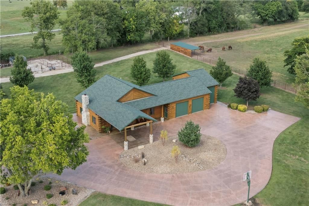 Welcome to a premier luxury equestrian estate where thoughtful design, pride of ownership, & refined country living come together. Set on beautifully maintained acreage, this exceptional property features a meticulously cared-for log home paired w/a well-equipped barn & purpose-built horse amenities offering comfort & functionality. The log home showcases architectural stone detailing, cohesive cabinetry throughout the kitchen, mudroom, & laundry, solid wood surfaces, distinctive hardware, durable low-maintenance finishes, covered porches, a stamped circular drive, & a 3-car garage including a dedicated tractor bay. The log exterior has been caulked & sealed every 3 years, & all garages feature epoxy-coated floors. Equestrian facilities include an approximately 50x185 fully lighted indoor arena w/overhead sprinklers & a riding surface w/a solid base, 6 inches of MA2 sand, & premium black dirt footing. The outdoor arena is also lighted w/matching black dirt footing. Fencing is primarily pipe fencing, w/perimeter fencing of wired top 3 strands & smooth bottom 2 strands, enhanced by hot wire along all wire fencing. Stall gates are baby-proofed w/fully enclosed bottoms & tie-back chains, stall dividers are removable to combine 2 stalls, & one stall includes wall heaters for early foaling. Water access includes hydrants at the shelter N of the home, throughout horse areas, & at the front entrance. Automatic waterers include Ritchie units in pastures & Nelson waterers in interior stalls, w/feed & tack rooms. Pastures have been sprayed for weeds, fertilized annually, & reseeded this past fall, w/E & S pastures planted in K31 & the front pasture near the barn featuring a specialized non-fescue grass blend for broodmares requiring fescue-free grazing. Grounds are clean & clear of dead trees & weeds. Convenient 50-amp electrical hookups on the barn & near the arena provide trailer & RV connections.