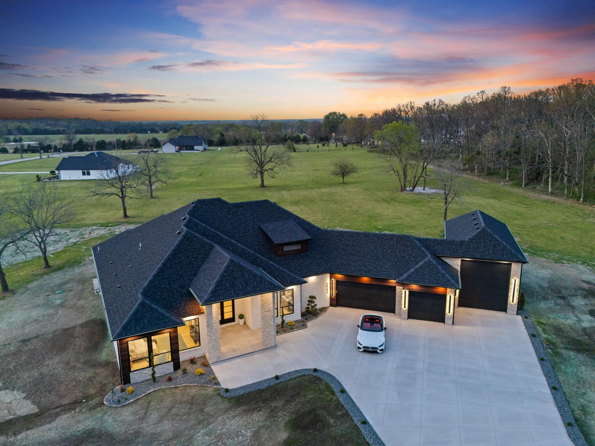 Experience luxury living in this stunning newly built home situated on 3 acres, showcasing exceptional craftsmanship and custom details throughout. This thoughtfully designed residence features 4 spacious bedrooms, including 2 master suites, an office, 3 full bathrooms, a convenient powder room, along with an oversized 3-car garage and an impressive 40 x 16 RV garage with 14' door. The open-concept floor plan boasts soaring ceilings, expansive windows that flood the home with natural light, beautiful hardwood flooring, custom designer cabinetry, granite countertops throughout, and stainless steel appliances including the refrigerator. Retreat to the luxurious primary suite, complete with Andersen floor-to-ceiling windows, a spa-like bathroom featuring a tiled curbless walk-in shower, soaking tub, and a generous walk-in closet with custom shelving. Additional upgrades include a water softener and whole-house humidifier for added comfort and convenience. Step outside to a covered patio--perfect for entertaining--overlooking the spacious acreage. With durable all-brick construction and a prime location with only a few minutes from Fellows Lake, this home truly offers the best of style, function, and quality. Schedule your private showing today!