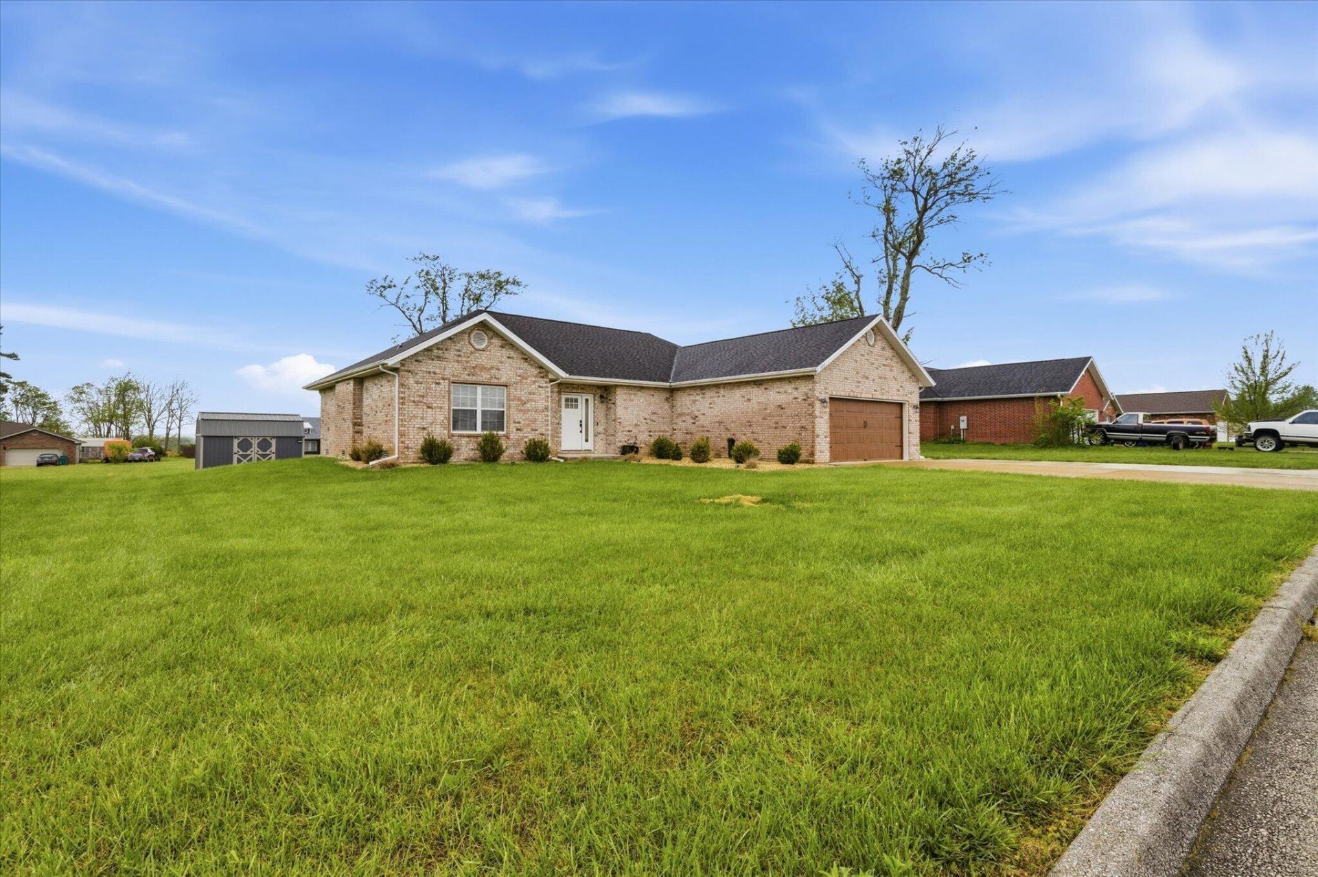 This beautifully maintained 3-bed, 2-bath brick home sits in a well-kept north-side Mountain Grove neighborhood just minutes from Walmart and other amenities, offering an unbeatable blend of comfort and convenience. A new roof and striking wood two-car garage door set the tone for the quality inside, where a spacious living room with an electric fireplace welcomes you in. The bright, updated kitchen features white custom cabinets, quartz countertops, stainless steel appliances, and ceramic tile flooring that continues into the dining area. All three bedrooms are well-sized and thoughtfully arranged, offering excellent closet space with built-in shoe racks for effortless organization. Both bathrooms are clean and updated, and a newer HVAC system provides peace of mind. The garage boasts a fresh epoxy floor coating, and the backyard includes a new mower shed, rounding out a home that's truly move-in ready and built with care.