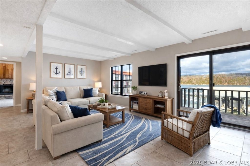 Opportunities like a this 6 bedroom condo are RARE! 6 bedrooms & 3 bathrooms on the water, no unit above you, with two full levels, is an incredible value for the space. Freshly painted with updated countertops and fixtures, this unit offers a bright, open main level and panoramic lake views from the living room, kitchen and 4 bedrooms for a true 'on-the-water feel. The primary suite features a private bath, stone wood-burning fireplace, and private balcony. Main level also includes laundry and an additional full bath. Upstairs are 5 spacious bedrooms and another full bath-ideal for large groups or strong rental potential (3 months or more). Just steps to your 14x30 boat slip on Dock 5 (6th slip on right) with unobstructed views. Right out your door is the community pool, pet area and convenient parking. Incredible views of the Osage 29MM near Paradise, Margaritaville, dining, golf and shopping. If you want space, views and a prime lakefront location - this one delivers.
