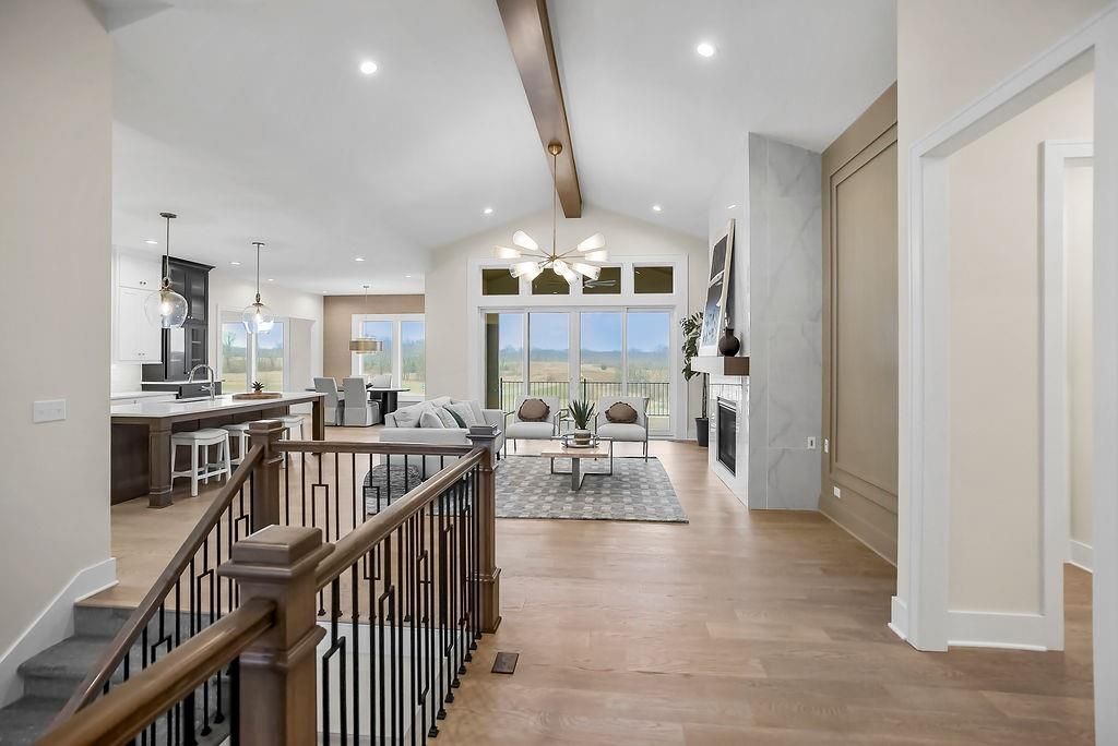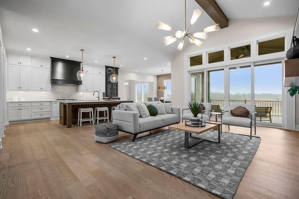 The stunning Santa Fe Reverse 1.5 by Rodrock Homes features soft-contemporary styling with four-sided construction, low-pitch rooflines, and elegant stone accents. A 4-car garage (2 front, 2 side) offers ample space for vehicles, storage, and toys. The center-island kitchen overlooks a spacious Great Room with a vaulted ceiling and detailed trim accents. A cozy Hearth Room off the breakfast area includes a fireplace for quiet everyday enjoyment. The resort-style Primary Suite offers an oversized walk-in closet, separate tub and shower, and convenient access to the main-level laundry. The main level also includes a flexible Study/Bedroom with a private full bath.The finished lower level is designed for entertaining?featuring an elegant wet bar, media area, space for a game table, and generous secondary bedrooms each with their own baths. Enjoy beautiful wooded scenery from the covered deck. Located in Sundance Ridge, residents enjoy a multi-million-dollar amenities center, The Village, offering a welcoming clubhouse and two swimming pools. Additional planned amenities include a state-of-the-art indoor gymnasium, pickleball courts, bocce ball, playground, community garden, and nature trails connecting all three neighborhoods. Resort-style clubhouse, fitness center, and the first pool are now open!Home is move-in ready, featuring high-end upgrades and designer selections throughout for a truly show-stopping finish.