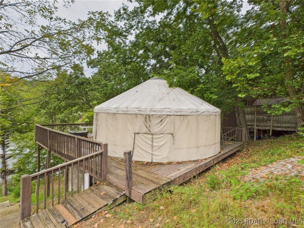 Your Lake of the Ozarks getaway awaits at the 70 MM with this unique waterfront investment opportunity! Listed at just $82,000, the property features a yurt-style retreat perched on a concrete foundation with a deck and concrete stairs leading to an included 2-well dock with swim platform. Beyond the immediate recreation, there is serious income potential; a local property management company estimates this unit could generate nearly $27,000/year once a well and septic are installed. With electricity already there, 75 feet of frontage, and no zoning or HOA restrictions, this is the perfect spot to build equity, enjoy the lake, or plan your future dream home.
