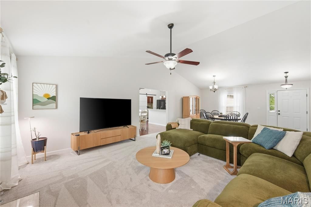 A gorgeous, great room ranch with a finished walkout lower level located on a quiet cul-de-sac in sought-after Lake St. Louis, The owners recently updated and transformed the home to today's style. Their long hours or labor and work are your gain! New paint and new carpet throughout the main level in 2025. Updated curb appeal with a new stone mailbox, fresh landscaping, brick accents, and a covered front porch. Inside, you are invited by a vaulted great room featuring a gas fireplace with marble surround. The open-concept kitchen features maple cabinetry, a peninsula with raised breakfast bar, pendant lighting, and black appliances, flowing seamlessly into the breakfast room and onto a 12x10 covered deck- overlooking your tree lined backyard, perfect for relaxing. Leading to the immaculate garage with epoxy coating floors is a main level laundry and pantry. A gorgeous primary suite offers a coffered ceiling, dual vanity, and separate tub/shower. Two additional bedrooms and a full bath complete the main level. The finished, walkout lower level adds another 1100 sq ft of living space including a family room, 4th bedroom, and full bath-perfect for your guests or a private home office. Enjoy a prime location close to Founders Park, Quail Ridge Park, I64 and I70 for easy access to interstates.