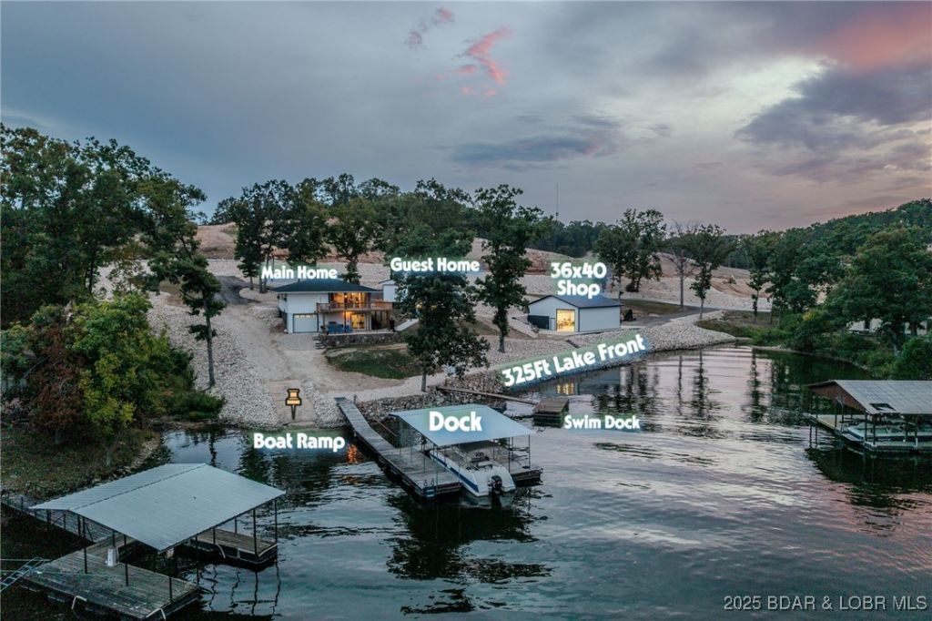 What a cool setup here! 1.2 Acres that has been completely rocked and offers a 3 bed, 3 bath main home with attached 2 car garage, main level living with 3 bedrooms and 2 full baths, large open living/dining area and galley style kitchen, lower level offers wide open space with 2nd living area, 2nd kitchen and 3rd full bath. 960sqft Guest home that sleeps 4 comfortably and has been completely updated with all new exterior paint, metal roof, all new luxury vinyl plank flooring, mini split, new interior paint, recessed lighting, a custom-built spiral staircase leads you to the studio style lower level with all tile flooring, recessed lighting and completely furnished. Great lakeside patio area to hang with all the guests! Next is the 36x40 lakeside shop building offering two 12x12 doors and a drive through set up complete with concrete flooring and electric. Tons and tons of parking on this property! So much work has already been put into this place! Would make an excellent rental property or live in one and rent out the other- Possible RV Park going in across the street and right next door to Buck Creek Marina! Tucked back in South Buck Creek cove offering deep water!