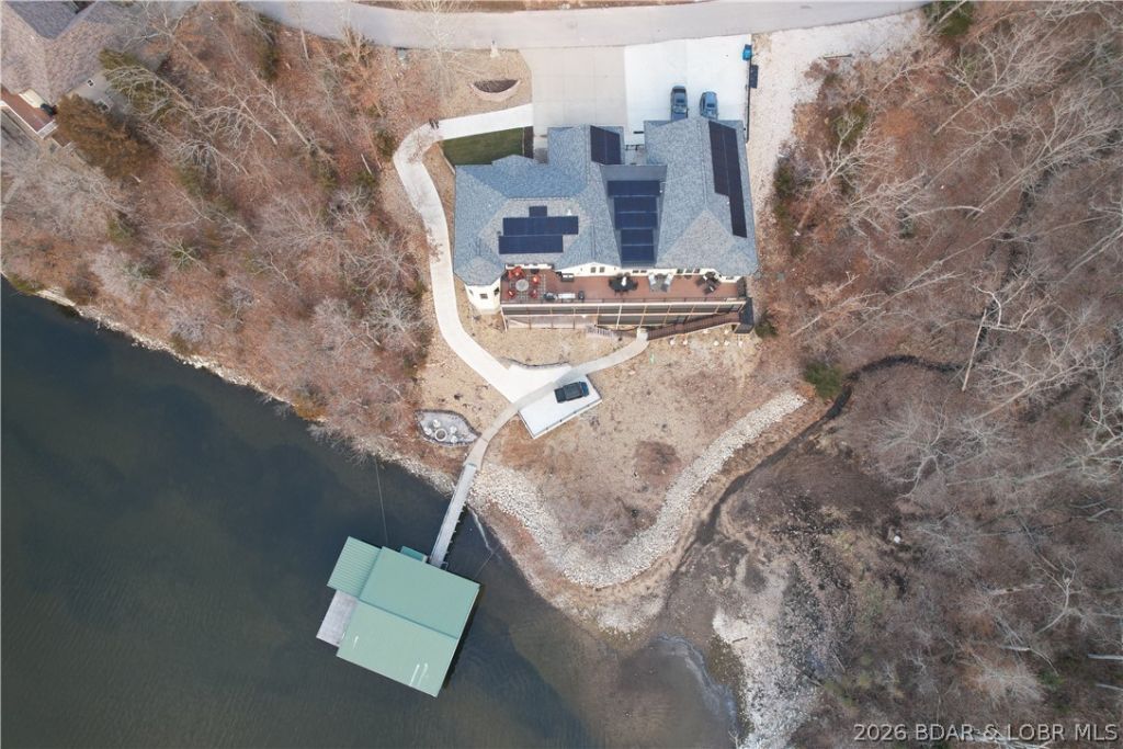 Move-In Ready! Solar Efficient Lake Home with energy bill averaging $80 per month! You don't want to miss this exclusive lakefront home with dock in Linn Creek Cove, MM31, Lake of the Ozarks. This custom furnished home has a 2023 new build with a 2010 fully renovated wing located in the established quiet Cross Creek neighborhood, sitting on 1.74 acres, has a fabulous lakefront view & 621 feet of lake frontage. The home boasts 5670 sq. ft. of interior living space,4 car garage bays with oversized garage area,& add'l parking on the wide, gentle sloped concrete driveway.The main interior floor offers open floor living, vaulted ceiling,stacked stone gas fireplace, chef's kitchen & dining room with hardwood floors. It features a great room, 2 master ensuites, 2 add'l beds, add'l 1.5 baths, & laundry. Lower level boasts family rm, entertainment rm, 3 beds, exercise/bonus rm, office/bedrm, 3 baths, bar room, & dining area. Enjoy your hot tub, wet bar, sitting area, game area, & lakeside firepit. A concrete dock with 2 boat slips, double PWC slip, swim platform, dock bar, & storage area completes the package. A perfect home to enjoy year-round or seasonal with your family and friends!
