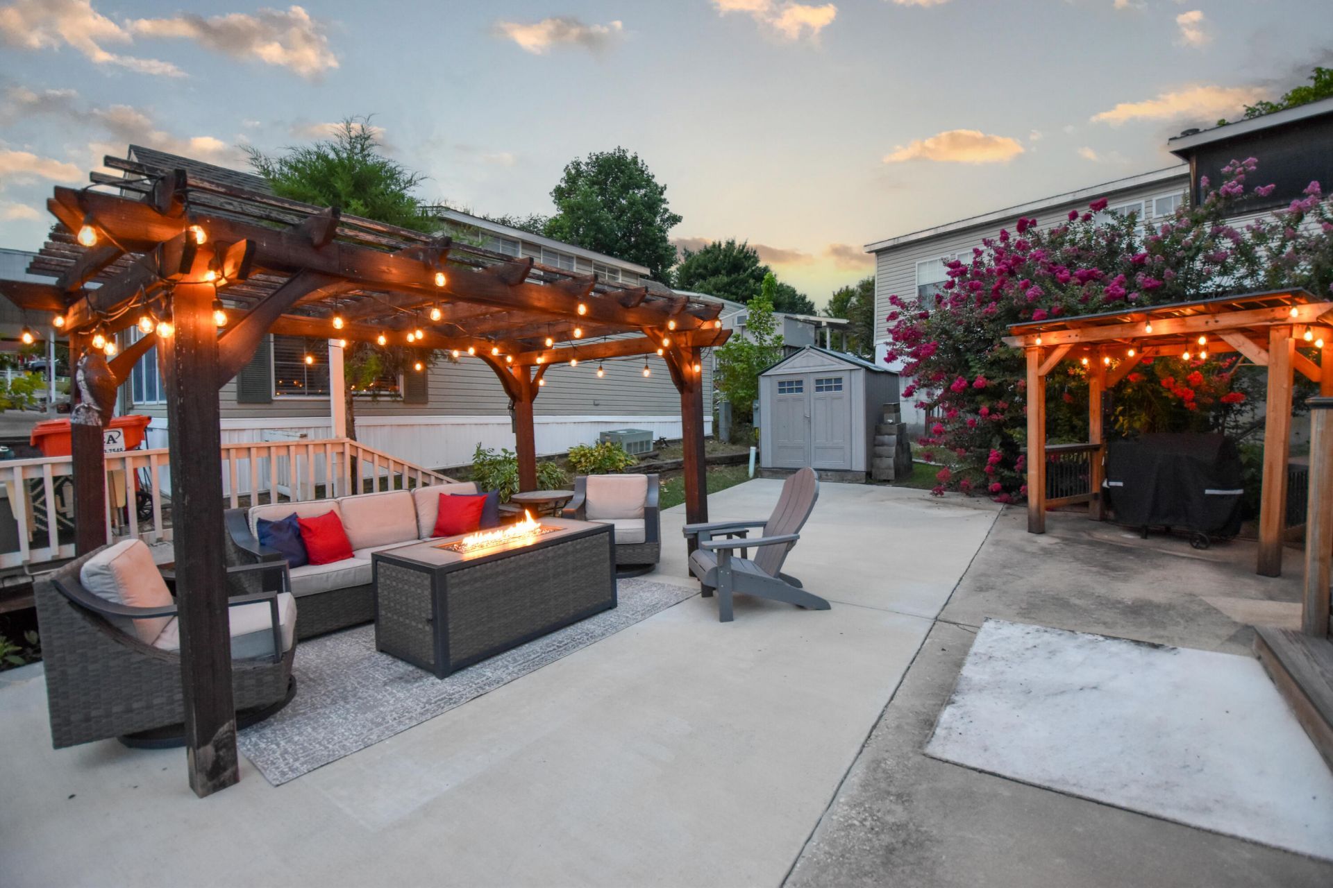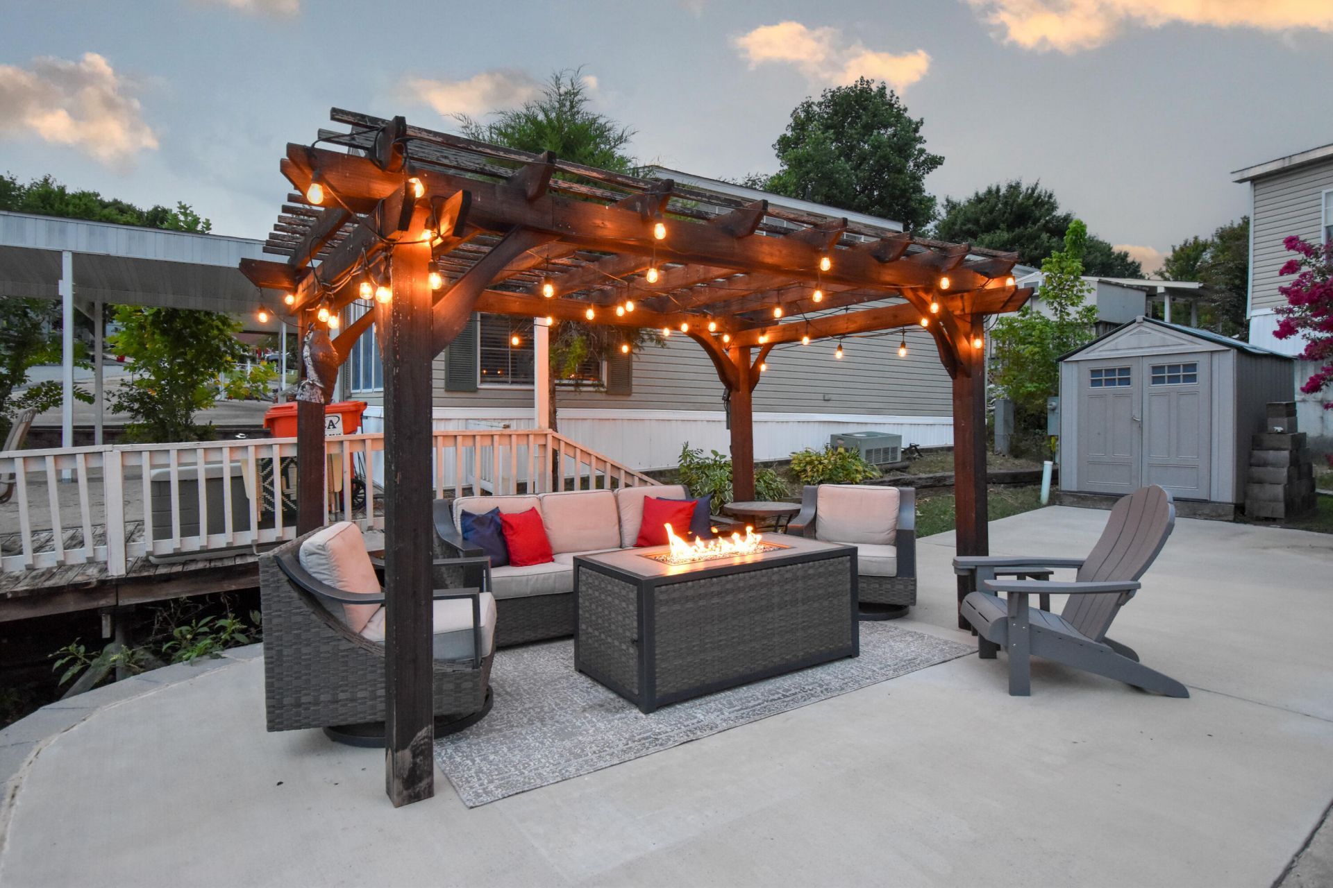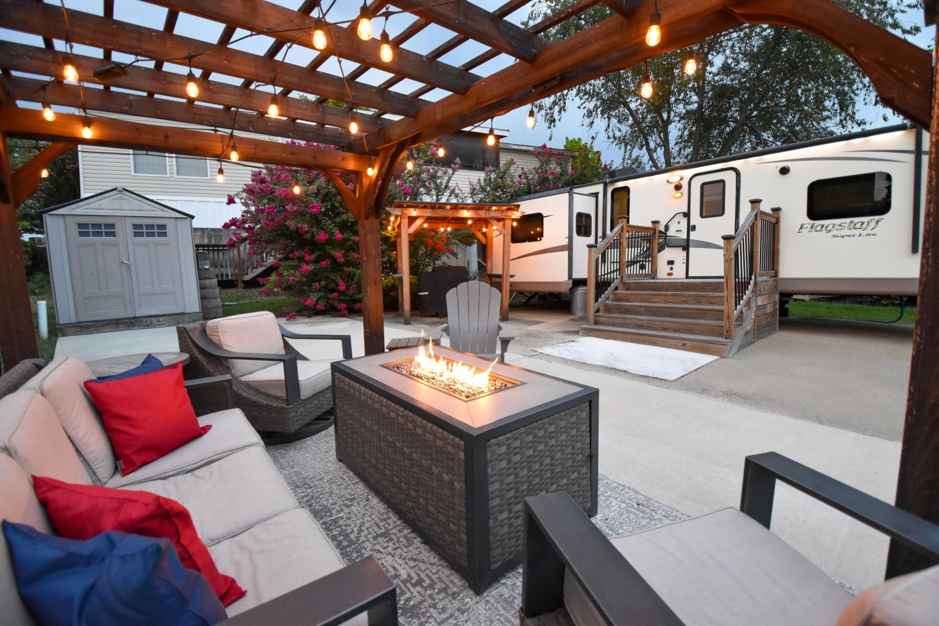 This charming, fully furnished, lake retreat is nestled in Fall Creek RV Estates on a 0.066 acre lot. It includes the lot and a 2015 Flagstaff 30' travel trailer, with 3 slide outs. The trailer features 1 bedroom, 1 bathroom, and sleeps 4 with a pullout sofa in the living area. The spacious kitchen offers a peninsula, gas cooktop and oven, microwave, and a fridge/freezer. Enjoy an electric fireplace and built-in entertainment with a Smart TV, radio system and surround sound-indoors and out!Step outside to your own private oasis complete with an accent-lit pergola, gas fire-pit, comfortable seating, grill under its own covered pergola, retractable awning, and a 7x7 storage shed for all your lake gear. In August of 2022, the roof was replaced, and the concrete patio was expanded to provide lots of outdoor relaxation space. Located just 2 minutes to great fishing on Lake Taneycomo and under 10 minutes to Table Rock Dam, Moonshine Beach and the 76 strip.