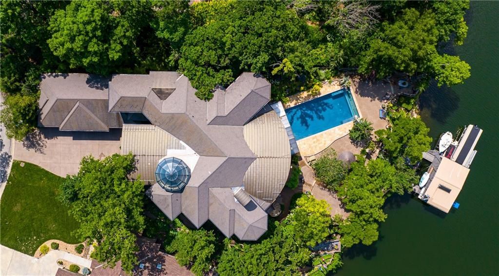 With an expansive lake front view, this home was designed for grand-scale entertaining yet tranquil retreat living. A museum-worthy 1,000 bottle wine room and glass dome-topped, free-floating 3 story spiral staircase greet you upon entering custom front doors. Prepare to be wowed by a 26-foot barrel wood ceiling, extending thru the home, and 900-gallon living reef, saltwater aquarium. High-end finishes/fixtures throughout include natural stones, rare woods, Labradorite main kitchen countertops, and hand-blown glass Chihuly chandelier. Stunning architectural ceilings include one-of-a-kind dining room ceiling - truly a work of art. Private Primary Suite hallway with marble mosaic floor, beverage bar, and stairway to the library & gym/spa. Suite includes fireplace, home theater system, steam shower, and deck access. Telescoping enclosure enables year-round use of infinity-edge pool. Lovely al fresco deck-dining with outdoor kitchen, custom granite 22-person table, fireplace, TV, & lake views. Indoors connects to outside via LL bi-folding doors, spa room and deck staircase. Lush, extensively landscaped grounds include gas torches, fountains, waterfalls, lighting, & integrated, computer-driven bug suppression system. Double boat dock with 4 hydro lifts. Appreciate the convenience & comfort of a 5 stop/2 door elevator, the latest smart home integrated system, 2 laundry rooms, dog shower, greenhouse, back-up generators, and heated driveway, steps, deck, main & lower-level European limestone floors. Midwestern-friendly, the Lake Winnebago community and well-stocked, 400-acre lake include many amenities. Why vacation at the lake when you can live the lifestyle every day? Home located less than 30 min from KC, in Lees Summit school district.