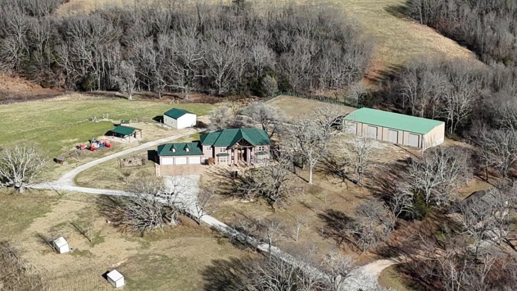 Welcome to a remarkable 320-acre estate just 8 minutes north of Branson West, where stunning views and tranquility meet adventure. This extraordinary property features a spacious 6800 m/l sq. ft. lodge designed for comfort and entertainment, boasting 8 bedrooms, 6 bathrooms, and a well-appointed commercial-grade kitchen perfect for hosting gatherings. Unwind by the fireplace or enjoy the expansive outdoor spaces ideal for family fun. Outdoor living is a highlight with a 20x30 outdoor kitchen/pavilion, perfect for summer barbecues and entertaining guests. Equestrian enthusiasts will love the impressive 100x125 horse arena, along with a 4-stall shop that includes a dedicated paint stall. This estate is suitable for various pursuits, from an equestrian center and hunting lodge to potential development opportunities. Ideal for horseback riding, biking, or ATV adventures, on over 20 miles of trails meandering through majestic stands of oak, black walnut, and cedar glades. Nature's beauty is amplified by two year-round springs, a captivating cave, and serene ponds, providing a perfect setting for hiking, or simply enjoying the peaceful surroundings. With its versatile spaces, picturesque views, and endless recreational opportunities, this 320-acre retreat is an extraordinary find. Don't miss your chance to own this expansive paradise. Whether you're seeking a peaceful sanctuary, abundant adventures, or a unique investment opportunity, this property has it all. The property has a gated entrance and security system for maintaining privacy.