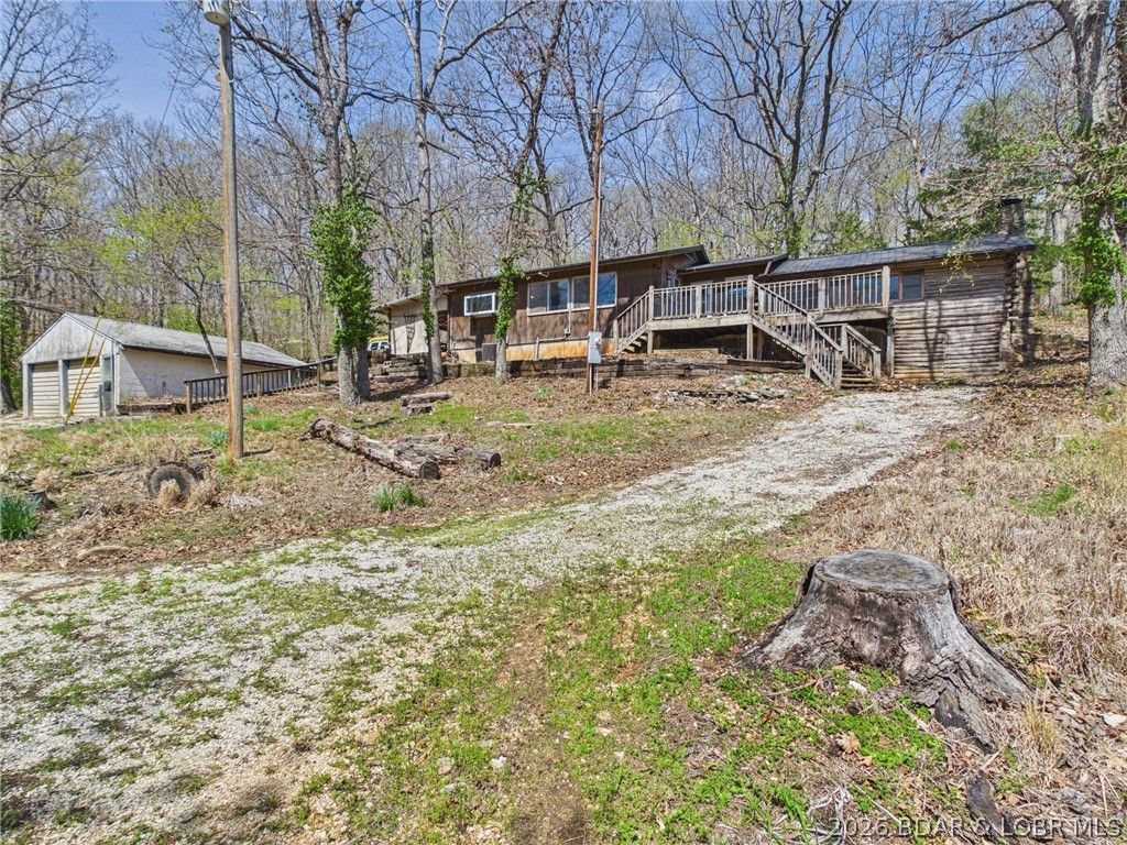 Trade the subdivision for the sound of silence at this 11+ acre wooded basecamp in Stover. The heart of the home is a true stacked-log cabin-providing a rugged, authentic Ozark character you simply cannot recreate-now expanded into a functional 1,300+ sq ft, 2-bed, 1-bath residence. Best of all? You can work from the woods with high-speed internet available. Surrounded by heavy timber on three sides, this property is a outdoorsman's dream. The detached 2-car garage is ready for ATVs and lake toys, while the terrain features a natural backstop area perfect for a private shooting range or target practice. With frequent deer and turkey sightings, you can hunt or wildlife-watch directly from your covered concrete patio. Enjoy unmatched seclusion just minutes from the marina and lakefront amenities. Equipped with a new metal roof (2025), this property is built for the buyer who wants a tactical weekend getaway or a primary residence with zero neighbors in sight. Bring your tools and a little sweat equity to finish out this standout Ozark classic.