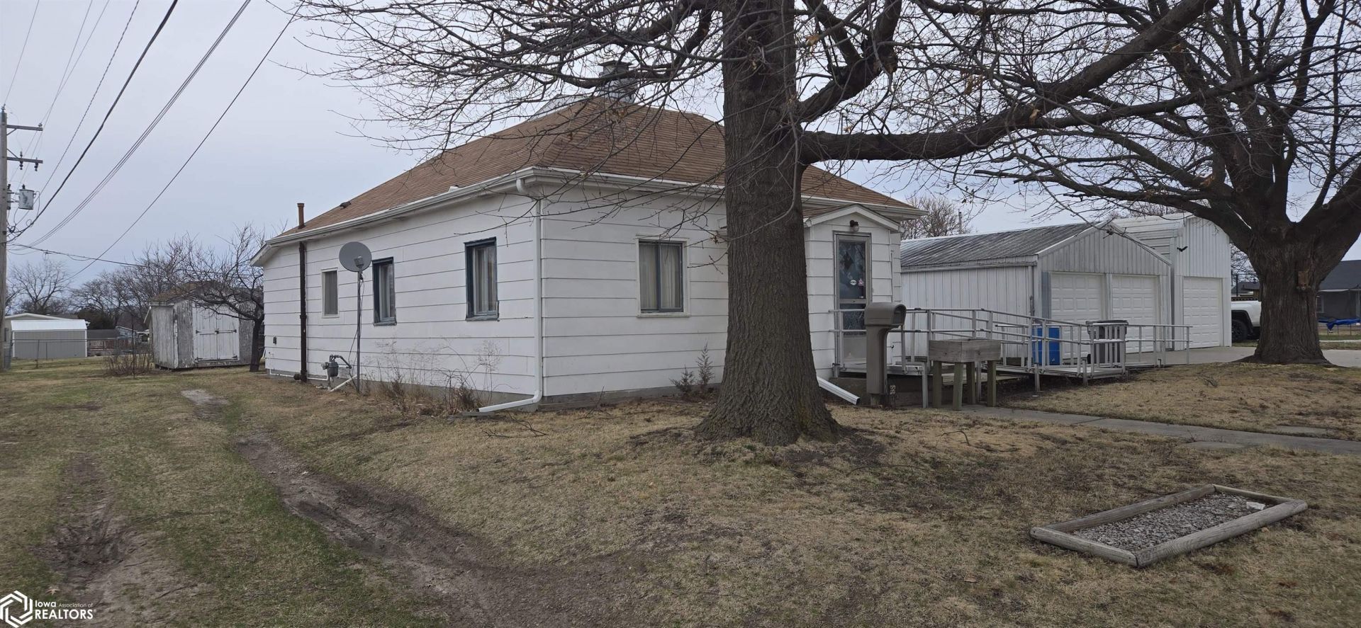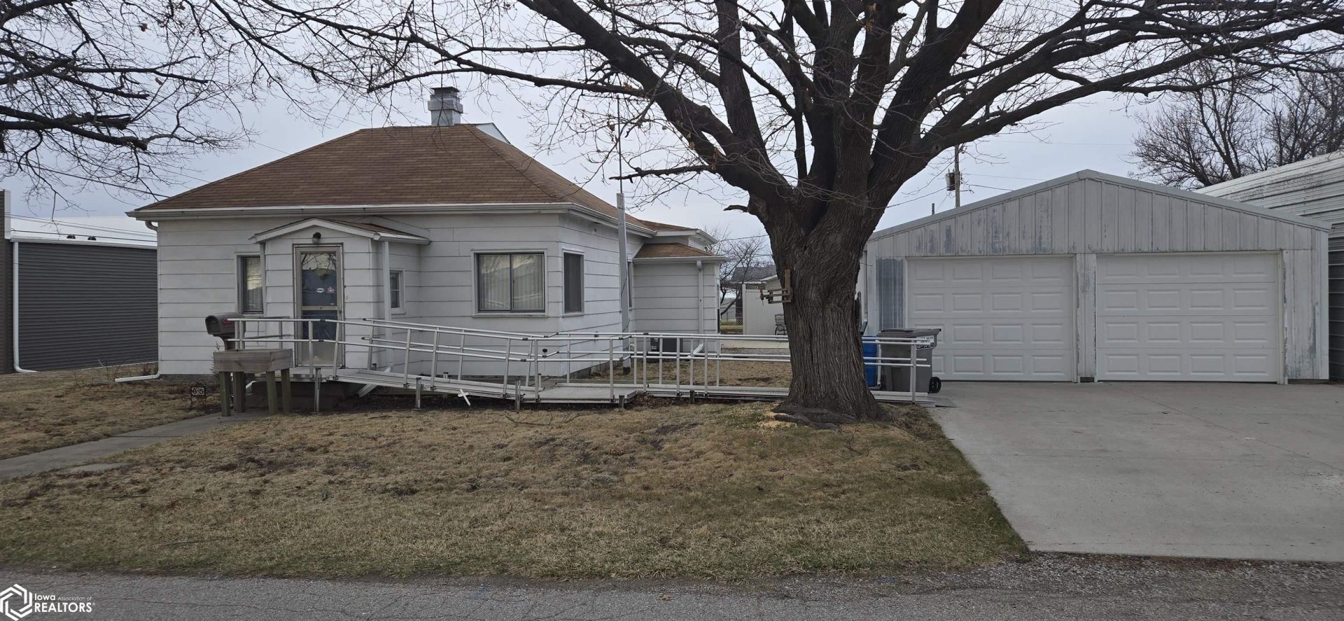 Well-kept 2-bedroom, 1-bath bungalow featuring a masonry fireplace and a functional layout. Exterior amenities include a 2-car detached garage with a small built-in shop, plus a covered carport with a garage door for additional sheltered parking. A large concrete driveway provides ample space for extra vehicles, trailers, or guest parking. Solid property with versatile storage and workspace options.