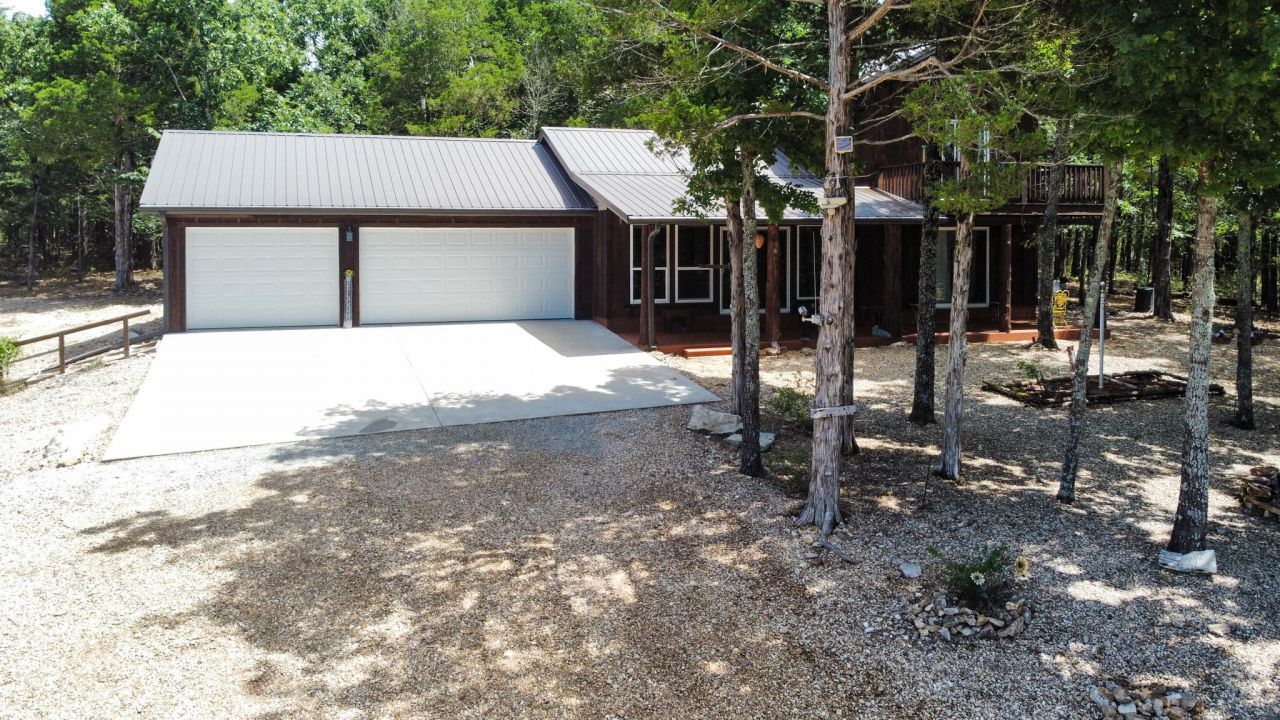 This 3 bedroom, 3 bath home sits on 6 lots in Country Club Hills, was built in 2019, has 1490 sq. ft. of living space, a 3 car attached garage, a metal roof, lots of privacy, and a fulltime view of Bull Shoals Lake. The 1.5 story home has a master bedroom on each level. The lower master had a sliding patio door going to a covered patio across the entire front of the house and the upstairs master has a sliding patio door leading out to a 16x8 deck. Both masters have fantastic lake views!! An additional bonus room upstairs could be used as an office or become the 4th bedroom (non-conforming). The kitchen does have a pantry and the cathedral ceilings with large wooden beams in the kitchen and living room areas give you that warm lake house feeling. An additional bedroom, a nice utility room, and a full bathroom are on this level as well. Outside, where you will spend the most of your time, is a firepit, a 12x16 storage building, and a 20x20 carport. With a rock lawn, there is no grass to cut and maintenance is very low. Who wants to be at the lake and have to do yard work anyway? Grass belongs on a golf course, which by the way...is just up the road.