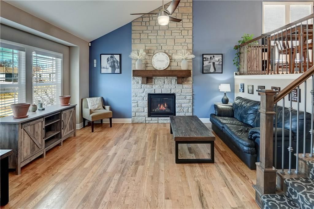 Beautifully maintained by its second owner, this custom California split is loaded with upgrades and smart design. Hardwood floors run through the great room, kitchen, breakfast room, primary suite, and the extra-wide upper hallway. The chefs kitchen features granite countertops, a giant island that seats four, a walk-in pantry, and room for an oversized dining table.The primary suite and guest half bath sit conveniently on the kitchen level. The walkout lower-level family room offers upgraded grouted luxury vinyl tile, recessed LED lighting, and a ceiling fan ? warm, durable, and perfect for everyday living.All bedrooms and living spaces include modern ceiling fans with remotes. Outside, the professional landscaping wraps the entire home with decorative rock, flowering shrubs, and no-maintenance mulch-free beds. Enjoy a well-kept deck with stairs leading to an oversized patio and a fully fenced backyard.Additional highlights include granite in all four bathrooms, upgraded stair carpet, sprinkler system, and standout curb appeal with stone trim, cedar-look accents, and a beautifully painted garage door. Neighborhood pool and common area included. Minutes from Lees Summit shopping, restaurants, highways, and top-rated schools.