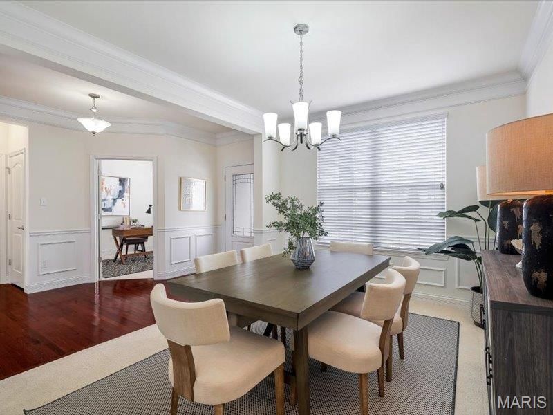 Located in the Estates at Town and Country Crossing, this 4-bedroom, 2.5-bath, 3,248 sf home combines contemporary elegance with everyday comfort in one of Chesterfield's most sought-after communities. Built in 2014 and carefully maintained, the residence reflects quality construction and attention to detail throughout.Rich hardwood floors flow through the light-filled main level, anchored by crown molding and an iron-spindle staircase. Formal dining and living areas are complemented by a gas fireplace, while the kitchen serves as the centerpiece with cherry cabinetry, granite countertops, glass tile backsplash, French door refrigerator, center island with seating, gas cooktop, double ovens, and a built-in desk area.Upstairs, the primary suite includes separate his-and-hers walk-in closets and a private ensuite bath. Three additional bedrooms and a full bath provide flexibility for guests, home office, or family living. Additional spaces include a main-level office or study, breakfast area, kitchen nook, and bonus room. The unfinished basement offers future expansion potential. Zoned HVAC, modern systems, and a 3-car attached garage add everyday comfort and convenience.Conveniently located near shopping, dining, schools, parks, and major highways, while offering privacy and a peaceful residential setting.