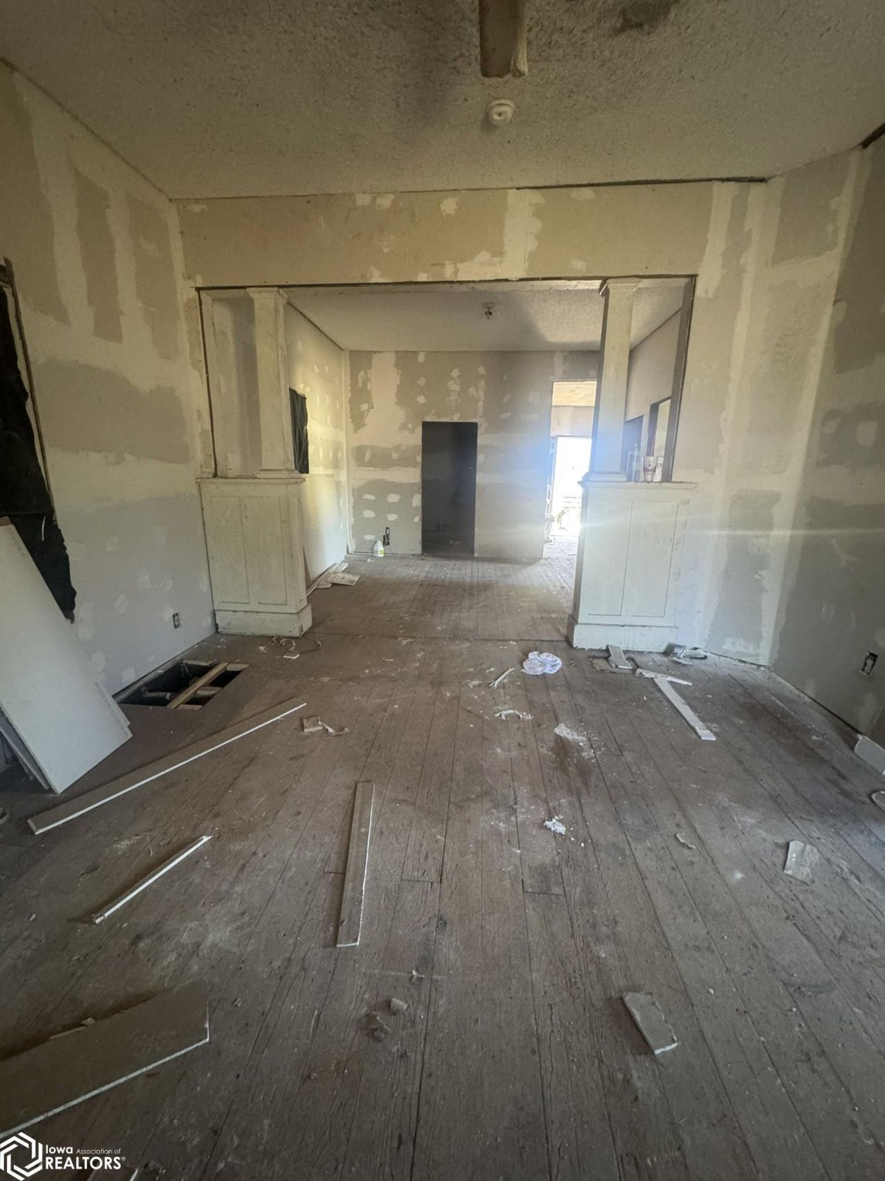 House is being sold as-is. Renovation has begun on the inside with the flooring demoed, exposing original hardwood floors, some new windows, and new drywall throughout most of the house. For those that can see the beauty through the chaos, this house has all the charm, with pony walls and columns separating the living and dining area. Great corner lot with a park (complete with pickleball court!) right across the street! Nice over-sized two car metal garage and shed for extra storage. The foundation and roof will need repaired. If you're looking for your next project, give an agent a call today for a showing!