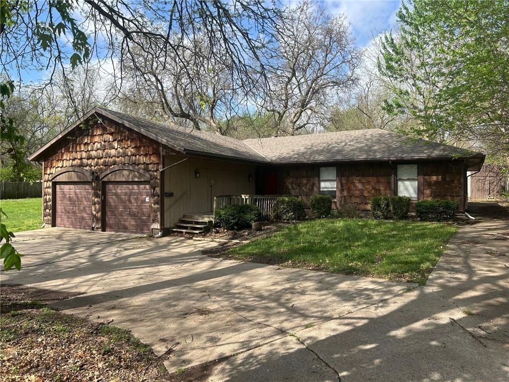 Ranch home on almost half an acre! When you enter the home, you are met by the huge, vaulted living room w/ceiling fan, gas fireplace, that also walks out to the deck. Oversized kitchen partially opens to the living room with tile floors that also walks out to deck. Great space for entertaining. Formal dining room, 1st floor laundry, plus an extra finished room for storage or hobbies. 3 full bathrooms and 3 good sized bedrooms in this home. 2 car attached garage plus 1 car detached garage/shop for storage and hobbies. Home is set back off the road with large trees and a circle driveway. Newer roof. Home does need some work and updating.