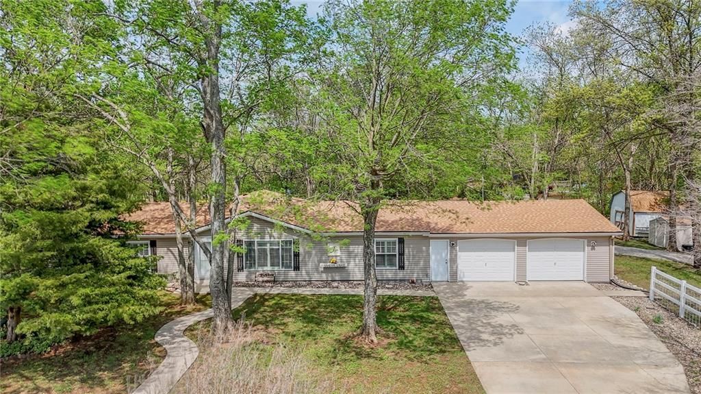 Beautifully updated ranch home, a rare find that offers exceptional privacy and space spread across four combined lots in the gated Linn Valley Lakes community. The interior boasts a spacious open layout with soaring vaulted ceilings, refreshed with bright paint colors and a whitewashed stone fireplace, stylish luxury vinyl plank flooring, and elegant plantation shutters throughout. At the heart of the home is a large kitchen featuring sleek quartz countertops, a walk-in pantry, and plenty of space for gatherings, making it an entertainers dream. The home also features a large primary suite and an impressive sunroom that provides significantly more square footage to the living space while flooding the home with natural light.Practicality meets the lake lifestyle with two outbuildings on-site, perfect for storing all your lake toys, tools, and gear. Major updates provide peace of mind, including a one-year-new roof, and while the home currently utilizes a cistern, the ability to connect to city water is currently being installed across the street for easy future access. Outside, the level, treed grounds feature a huge patio, private fire pit, hot tub and paved drive all while granting you access to premier resort amenities like the 18-hole golf course, private lakes, and community pools. Welcome home to Linn Valley Lakes!HOA fees for this property include the lot the house sits on and an additional 3 adjacent lot. Each lot has an HOA fee for the cumulative monthly HOA fee that is listed. Taxes and SqFt per county record. Room sizes approx. No preferences or limitations or discrimination because of any of the protected classes under Fair Housing.