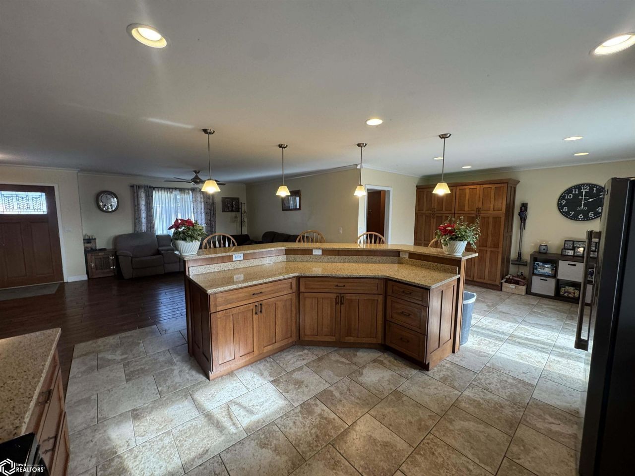 Executive 5-bedroom, 4-bath home offering over 2,500 square feet of finished living space, tucked away on a quiet dead-end road near the city park, local schools, and just a short distance from the Historic Centerville Square. The home also features a 2-car attached garage and peaceful rear views of rolling prairie and timber. Enjoy the large yard filled with mature oak trees?perfect for relaxing and watching wildlife and evening sunsets. Inside, you'll love the open-concept kitchen, dining, and living area featuring quarter-sawn oak cabinetry, quartz countertops, and a spacious island ideal for gathering. The home offers scraped hardwood floors, a cozy main-floor fireplace, and plenty of room to spread out with a large living room plus an additional family room in the lower level. Timeless character is found throughout, with features like bay windows, large closets, and abundant storage space?especially in the basement. Updates and extras include solar panels for low utility costs, a new furnace, an on-demand hot water heater, a water softener, and a full stainless-steel appliance package, including a washer and dryer that stay. Convenient main-level laundry adds to the ease of everyday living. If you've been dreaming of moving into a home and simply relaxing in a calm, nature-filled setting?this is a must-see. Home sits on just shy of an acre!