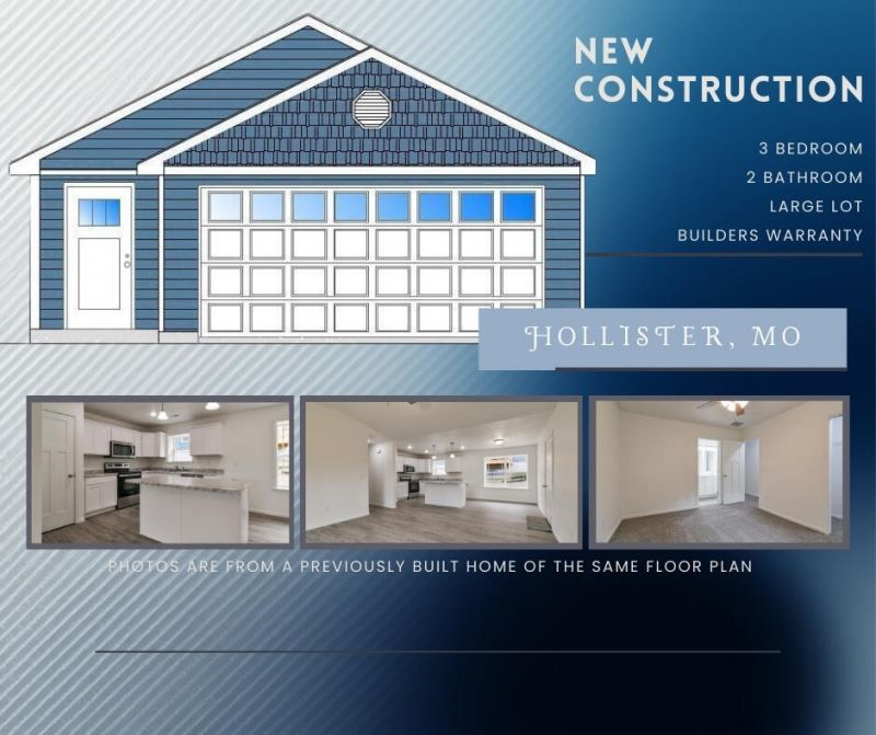 Pre-Construction opportunity! Seller will begin construction with a buyer deposit on this 3 bedroom and 2 bathroom, 1,196 sq ft single family home perfect for families and professionals alike. Enjoy the ease of low-maintenance living in a home that's just minutes from downtown Hollister, MO, and has quick access to Highway 65 for effortless commuting. Features include an open-concept living area, a sleek kitchen with contemporary finishes, and a spacious 2-car garage. The thoughtfully designed layout maximizes space and functionality, making it ideal for everyday living and entertaining. Don't miss the opportunity to own this brand-new home that combines affordability with modern amenities. Located at the very end of a quiet street on a large lot nearly half an acre! Photos and Matterport are of a previously built example home only.